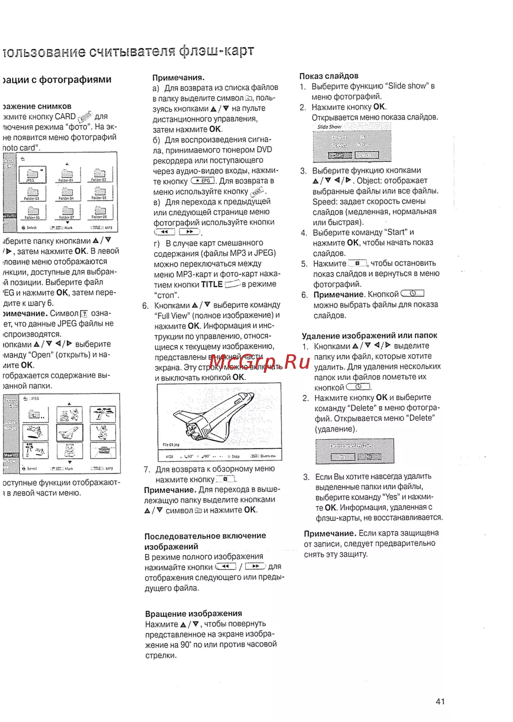 юльзование считывателя флэш карт ации с фотографиями зажение снимков жмите кнопку CARD для точения режима фото На эк ие появится меню фотографий noto card вберите папку кнопками А v затем нажмите ОК В левой ловине меню отображаются нкции доступные для выбран й позиции Выберите файл EG и нажмите ОК затем передите к шагу 6 зимечание Символ ознает что данные JPEG файлы не юпроизводятся юпкамиА v выберите манду Open открыть и налите ОК гображается содержание вы анной папки ступные функции отображают1 в левой части меню Примечания а Для возврата из списка файлов в папку выделите символ iù поль зуясь кнопками А V на пульте дистанционного управления затем нажмите ОК б Для воспроизведения сигна ла принимаемого тюнером DVD рекордера или поступающего через аудио видео входы нажми те кнопку С EPG Для возврата в меню используйте кнопку в Для перехода к предыдущей или следующей странице меню фотографий используйте кнопки Ç j г В случае карт смешанного содержания файлы MP3 и JPEG можно переключаться между меню МРЗ карт и фото карт нажа тием кнопки TITLE режиме стоп 6 Кнопками А V выберите команду Full View полное изображение и нажмите ОК Информация и инс трукции по управлению относя щиеся к текущему изображению представлены в нижней части экрана Эту строку можно включать и выключать кнопкой ОК 7 Для возврата к обзорному меню нажмите кнопку 30 Примечание Для перехода в выше лежащую папку выделите кнопками А Т символами нажмите ОК Последовательное включение изображений В режиме полного изображения нажимайте кнопки 1 для отображения следующего или преды Показ слайдов 1 Выберите функцию Slide show в меню фотографий 2 Нажмите кнопку ОК Открывается меню показа слайдов 3 Выберите функцию кнопками д V Object отображает выбранные файлы или все файлы Speed задает скорость смены слайдов медленная нормальная или быстрая 4 Выберите команду Start и нажмите ОК чтобы начать показ слайдов 5 Нажмите 33 чтобы остановить показ слайдов и вернуться в меню фотографий _____ 6 Примечание Кнопкой можно выбрать файлы для показа слайдов Удаление изображений или папок 1 Кнопками А V выделите папку или файл которые хотите удалить Для удаления нескольких папок или файлов пометьте их кнопкой 3__ I 2 Нажмите кнопку ОК и выберите команду Delete в меню фотогра фий Открывается меню Delete удаление 3 Если Вы хотите навсегда удалить выделенные папки или файлы выберите команду Yes и нажми те ОК Информация удаленная с флэш карты не восстанавливается Примечание Если карта защищена от записи следует предварительно снять эту защиту дущего файла Вращение изображения Нажмите А V чтобы повернуть представленное на экране изобра жение на 90е по или против часовой стрелки 41