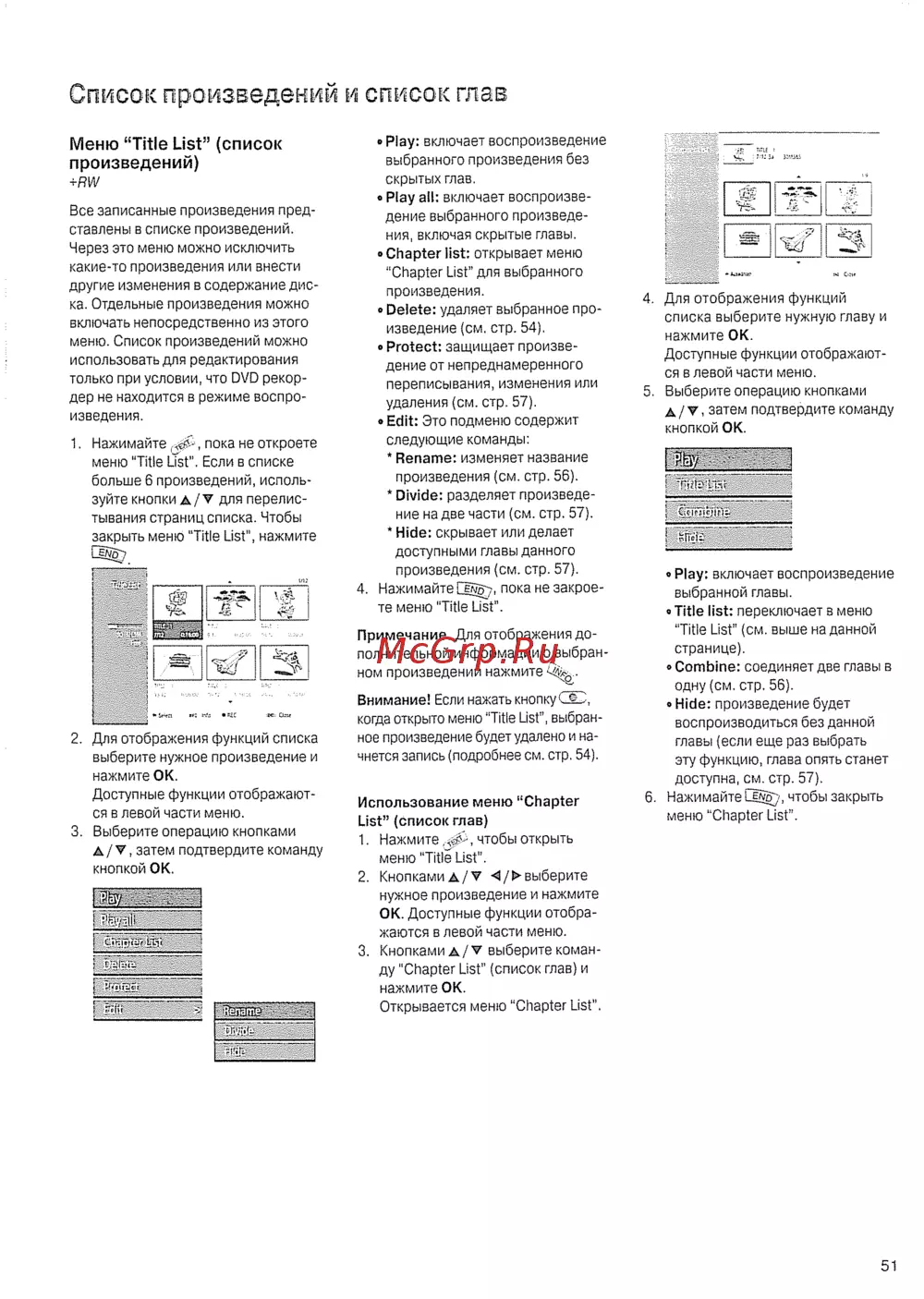 Список произведений и список глав Меню Title List список произведений RW Все записанные произведения пред ставлены в списке произведений Через это меню можно исключить какие то произведения или внести другие изменения в содержание дис ка Отдельные произведения можно включать непосредственно из этого меню Список произведений можно использовать для редактирования только при условии что DVD рекор дер не находится в режиме воспро изведения 1 Нажимайте пока не откроете меню Title Ust Если в списке больше 6 произведений исполь зуйте кнопки A V для перелис тывания страниц списка Чтобы закрыть меню Title Ust нажмите Play включает воспроизведение выбранного произведения без скрытых глав о Play all включает воспроизве дение выбранного произведе ния включая скрытые главы о Chapter list открывает меню Chapter List для выбранного произведения о Delete удаляет выбранное про изведение см стр 54 о Protect защищает произве дение от непреднамеренного переписывания изменения или удаления см стр 57 Edit Это подменю содержит следующие команды Rename изменяет название произведения см стр 56 Divide разделяет произведе ние на две части см стр 57 Hide скрывает или делает доступными главы данного произведения см стр 57 4 Нажимайте пока не закрое те меню Title List Примечание Для отображения до полнительной информации о выбран ном произведении нажмите 2 сражения функций списка м е нужное произведение и нажмите ОК Доступные функции отображают ся в левой части меню 3 Выберите операцию кнопками А V затем подтвердите команду кнопкой ОК Внимание Если нажать кнопку СЮ когда открыто меню Title List выбран ное произведение будет удалено и на чнется запись подробнее см стр 54 Использование меню Chapter List список глав 1 Нажмите чтобы открыть меню Title List 2 КнопкамиА V выберите нужное произведение и нажмите ОК Доступные функции отобра жаются в левой части меню 3 Кнопками А V выберите коман ду Chapter List список глав и нажмите ОК Открывается меню Chapter List 4 Для отображения функций списка выберите нужную главу и нажмите ОК Доступные функции отображают ся в левой части меню 5 Выберите операцию кнопками д Т затем подтвердите команду кнопкой ОК о Play включает воспроизведение выбранной главы Title list переключает в меню Title List см выше на данной странице о Combine соединяет две главы в одну см стр 56 о Hide произведение будет воспроизводиться без данной главы если еще раз выбрать эту функцию глава опять станет доступна см стр 57 6 Нажимайте Lg чтобы закрыть меню Chapter List 51