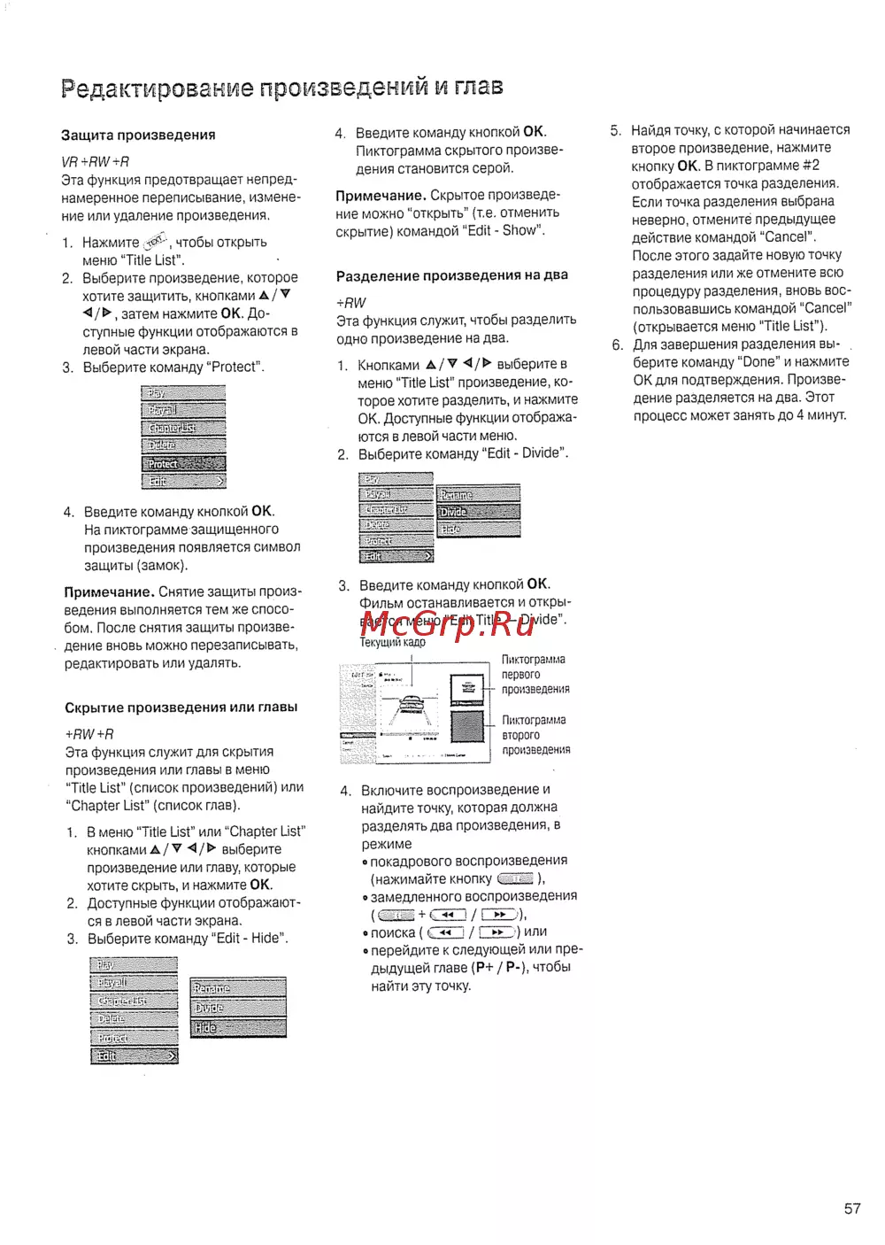 Редактирование произведении и глав Защита произведения VR RW R Эта функция предотвращает непред намеренное переписывание измене ние или удаление произведения 1 Нажмите чтобы открыть меню Title Ust 2 Выберите произведение которое хотите защитить кнопками А затем нажмите ОК До ступные функции отображаются в левой части экрана 3 Выберите команду Protect 4 Введите команду кнопкой ОК Пиктограмма скрытого произве дения становится серой Примечание Скрытое произведе ние можно открыть т е отменить скрытие командой Edit Show Разделение произведения на два RW Эта функция служит чтобы разделить одно произведение на два 1 Кнопками А V выберите в меню Title List произведение ко торое хотите разделить и нажмите ОК Доступные функции отобража ются в левой части меню 2 Выберите команду Edit Divide 4 Введите команду кнопкой ОК На пиктограмме защищенного произведения появляется символ защиты замок Примечание Снятие защиты произ ведения выполняется тем же спосо бом После снятия защиты произве дение вновь можно перезаписывать редактировать или удалять 5 Найдя точку с которой начинается второе произведение нажмите кнопку ОК В пиктограмме 2 отображается точка разделения Если точка разделения выбрана неверно отмените предыдущее действие командой Cancel После этого задайте новую точку разделения или же отмените всю процедуру разделения вновь вос пользовавшись командой Cancel открывается меню Title List 6 Для завершения разделения вы берите команду Done и нажмите ОК для подтверждения Произве дение разделяется на два Этот процесс может занять до 4 минут 3 Введите команду кнопкой OK Фильм останавливается и откры вается меню Edit Title Divide Текущий кадр Пиктограмма первого произведения Скрытие произведения или главы _ Пиктограмма RW R Эта функция служит для скрытия произведения или главы в меню Title List список произведений или Chapter List список глав 1 В меню Title List или Chapter List кнопками А v выберите произведение или главу которые хотите скрыть и нажмите ОК 2 Доступные функции отображают ся в левой части экрана 3 Выберите команду Edit Hide второго произведения 4 Включите воспроизведение и найдите точку которая должна разделять два произведения в режиме о покадрового воспроизведения нажимайте кнопку CZZZ замедленного воспроизведения с t I а поиска GEL EZEL или о перейдите к следующей или пре дыдущей главе Р Р чтобы найти эту точку 57