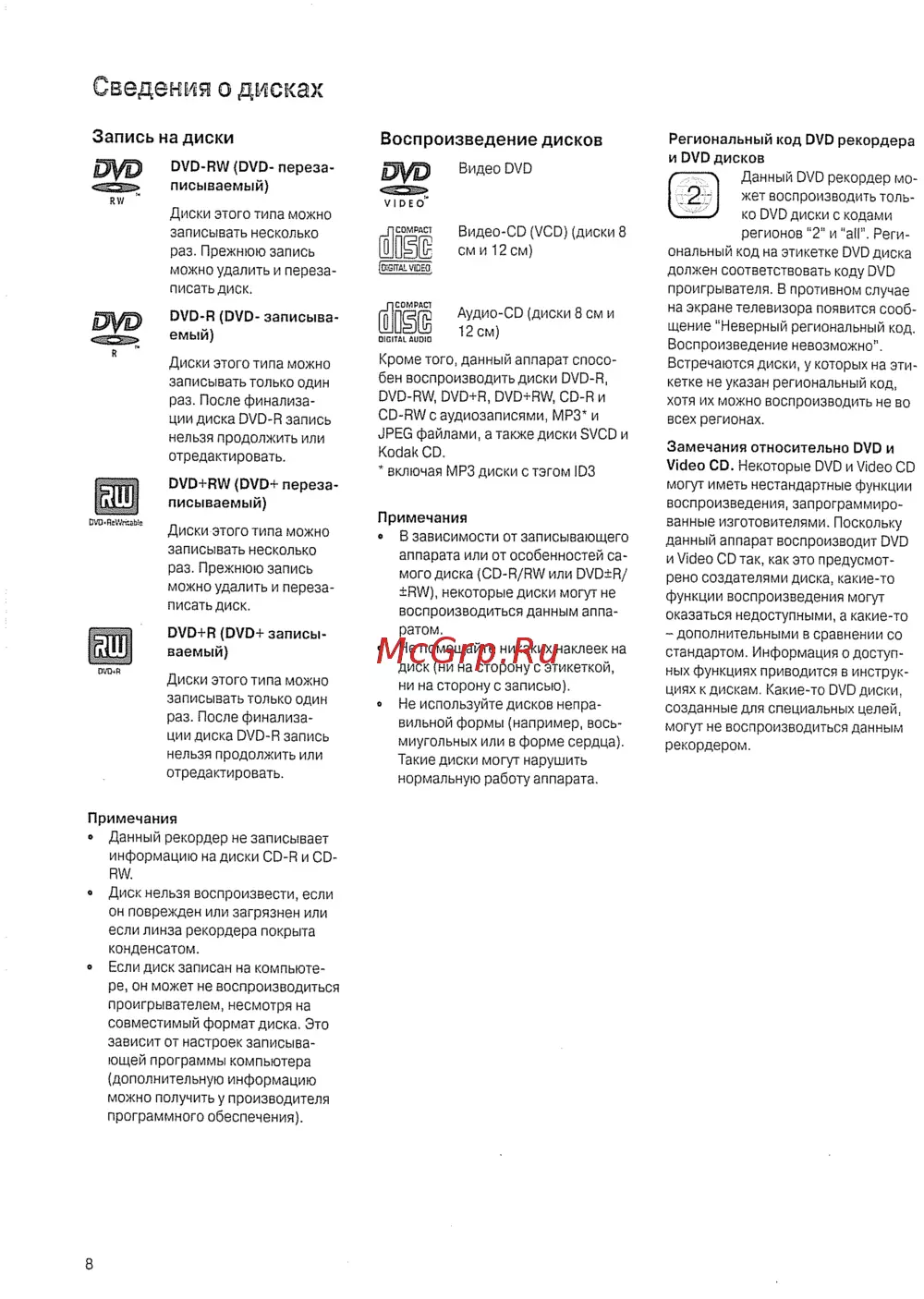Сведения о дисках Запись на диски DVD Воспроизведение дисков DVD RW DVD переза писываемый Видео DVD RW Диски этого типа можно записывать несколько раз Прежнюю запись можно удалить и переза писать диск DVD R DVD записыва емый Диски этого типа можно записывать только один раз После финализации диска DVD R запись нельзя продолжить или отредактировать ЯШ DVD ReWmabla DSGHAL VIDEO DIGITAL AUDIO Аудио CD диски 8 см и 12см Кроме того данный аппарат спосо бен воспроизводить диски DVD R DVD RW DVD R DVD RW CD R и CD RW с аудиозаписями MP3 и JPEG файлами а также диски SVCD и Kodak CD включая MP3 диски с тэгом ID3 DVD RW DVD переза писываемый Диски этого типа можно записывать несколько раз Прежнюю запись можно удалить и переза писать диск DVD R DVD записы ваемый DVO R Диски этого типа можно записывать только один раз После финализации диска DVD R запись нельзя продолжить или отредактировать Примечания Данный рекордер не записывает информацию на диски CD R и CDRW о Диск нельзя воспроизвести если он поврежден или загрязнен или если линза рекордера покрыта конденсатом Если диск записан на компьюте ре он может не воспроизводиться проигрывателем несмотря на совместимый формат диска Это зависит от настроек записыва ющей программы компьютера дополнительную информацию можно получить у производителя программного обеспечения 8 Видео CD VCD диски 8 iuSlfi см и 12 см Примечания о В зависимости от записывающего аппарата или от особенностей са мого диска CD R RW или RW некоторые диски могут не воспроизводиться данным аппа ратом Не помещайте никаких наклеек на диск ни на сторону с этикеткой ни на сторону с записью Не используйте дисков непра вильной формы например вось миугольных или в форме сердца Такие диски могут нарушить нормальную работу аппарата Региональный код DVD рекордера и DVD дисков Данный DVD рекордер мо2 жет воспроизводить толь ко DVD диски с кодами регионов 2 и all Реги ональный код на этикетке DVD диска должен соответствовать коду DVD проигрывателя В противном случае на экране телевизора появится сооб щение Неверный региональный код Воспроизведение невозможно Встречаются диски у которых на эти кетке не указан региональный код хотя их можно воспроизводить не во всех регионах Замечания относительно DVD и Video CD Некоторые DVD и Video CD могут иметь нестандартные функции воспроизведения запрограммиро ванные изготовителями Поскольку данный аппарат воспроизводит DVD и Video CD так как это предусмот рено создателями диска какие то функции воспроизведения могут оказаться недоступными а какие то дополнительными в сравнении со стандартом Информация о доступ ных функциях приводится в инструк циях к дискам Какие то DVD диски созданные для специальных целей могут не воспроизводиться данным рекордером