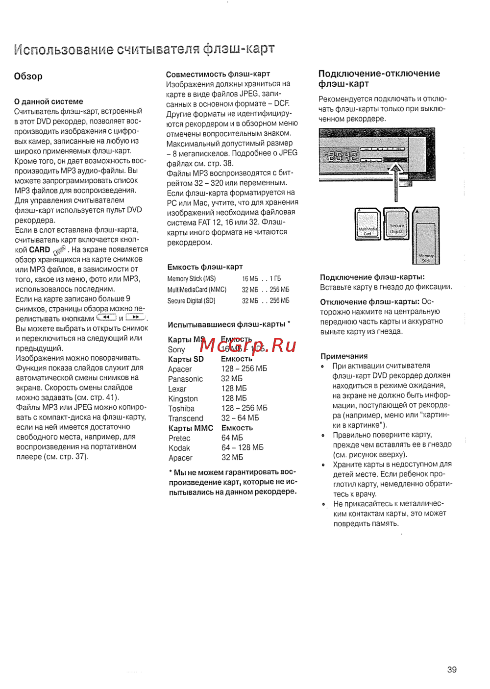 Использование считывателя флэш карт Обзор О данной системе Считыватель флэш карт встроенный в этот DVD рекордер позволяет вос производить изображения с цифро вых камер записанные на любую из широко применяемых флэш карт Кроме того он дает возможность вос производить MP3 аудио файлы Вы можете запрограммировать список MP3 файлов для воспроизведения Для управления считывателем флэш карт используется пульт DVD рекордера Если в слот вставлена флэш карта считыватель карт включается кноп кой CARD На экране появляется обзор хранящихся на карте снимков или MP3 файлов в зависимости от того какое из меню фото или MP3 использовалось последним Если на карте записано больше 9 снимков страницы обзора можно перелистывать кнопками и _ Вы можете выбрать и открыть снимок и переключиться на следующий или предыдущий Изображения можно поворачивать Функция показа слайдов служит для автоматической смены снимков на экране Скорость смены слайдов можно задавать см стр 41 Файлы MP3 или JPEG можно копиро вать с компакт диска на флэш карту если на ней имеется достаточно свободного места например для воспроизведения на портативном плеере см стр 37 Совместимость флэш карт Изображения должны храниться на карте в виде файлов JPEG запи санных в основном формате DCF Другие форматы не идентифициру ются рекордером и в обзорном меню отмечены вопросительным знаком Максимальный допустимый размер 8 мегапискелов Подробнее о JPEG файлах см стр 38 Файлы MP3 воспроизводятся с бит рейтом 32 320 или переменным Если флэш карта форматируется на PC или Мас учтите что для хранения изображений необходима файловая система FAT 12 16 или 32 Флэшкарты иного формата не читаются рекордером Подключение отключение флэш карт Рекомендуется подключать и отклю чать флэш карты только при выклю ченном рекордере Емкость флэш карт Memory Stick MS 16 МБ 1 ГБ MultiMediaCard ММС 32 МБ 256 МБ Secure Dígita SD 32 МБ 256 МБ Испытывавшиеся флэш карты Карты MS Sony Карты SD Apacer Panasonic Lexar Kingston Toshiba Transcend Карты ММС Pretec Kodak Apacer Емкость 16МБ 1 ГБ Емкость 128 256 МБ 32 МБ 128 МБ 128 МБ 128 256 МБ 32 64 МБ Емкость 64 МБ 64 128 МБ 32 МБ Мы не можем гарантировать вос произведение карт которые не ис пытывались на данном рекордере Подключение флэш карты Вставьте карту в гнездо до фиксации Отключение флэш карты Ос торожно нажмите на центральную переднюю часть карты и аккуратно выньте карту из гнезда Примечания При активации считывателя флэш карт DVD рекордер должен находиться в режиме ожидания на экране не должно быть инфор мации поступающей от рекорде ра например меню или картин ки в картинке о Правильно поверните карту прежде чем вставлять ее в гнездо см рисунок вверху Храните карты в недоступном для детей месте Если ребенок про глотил карту немедленно обрати тесь к врачу Не прикасайтесь к металличес ким контактам карты это может повредить память 39