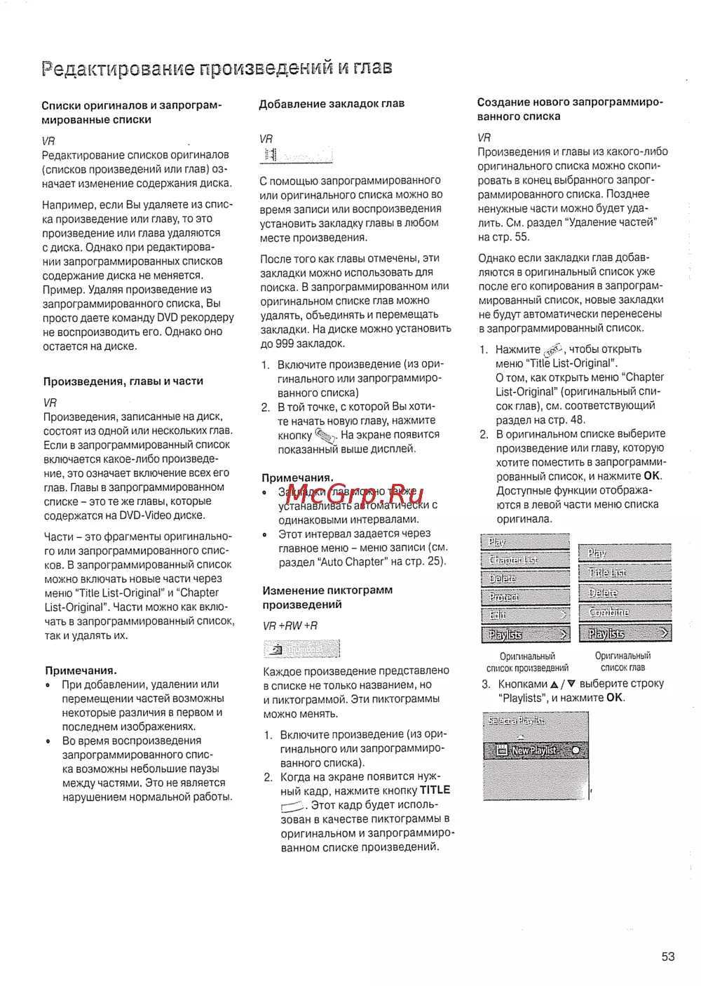Редактирование произведении и глав Списки оригиналов и запрограм мированные списки Добавление закладок глав Создание нового запрограммиро ванного списка VR Редактирование списков оригиналов списков произведений или глав оз начает изменение содержания диска VR VR Произведения и главы из какого либо оригинального списка можно скопи ровать в конец выбранного запрог раммированного списка Позднее ненужные части можно будет уда лить См раздел Удаление частей на стр 55 Например если Вы удаляете из спис ка произведение или главу то это произведение или глава удаляются с диска Однако при редактирова нии запрограммированных списков содержание диска не меняется Пример Удаляя произведение из запрограммированного списка Вы просто даете команду DVD рекордеру не воспроизводить его Однако оно остается надиске Произведения главы и части VR Произведения записанные на диск состоят из одной или нескольких глав Если в запрограммированный список включается какое либо произведе ние это означает включение всех его глав Главы в запрограммированном списке это те же главы которые содержатся на DVD Video диске Части это фрагменты оригинально го или запрограммированного спис ков В запрограммированный список можно включать новые части через меню Title List Original и Chapter List Original Части можно как вклю чать в запрограммированный список так и удалять их С помощью запрограммированного или оригинального списка можно во время записи или воспроизведения установить закладку главы в любом месте произведения После того как главы отмечены эти закладки можно использовать для поиска В запрограммированном или оригинальном списке глав можно удалять объединять и перемещать закладки На диске можно установить до 999 закладок 1 Включите произведение из ори гинального или запрограммиро ванного списка 2 В той точке с которой Вы хоти те начать новую главу нажмите кнопку На экране появится показанный выше дисплей Примечания о Закладки глав можно также устанавливать автоматически с одинаковыми интервалами о Этот интервал задается через главное меню меню записи см раздел Auto Chapter на стр 25 1 Нажмите чтобы открыть меню Title List Original О том как открыть меню Chapter List Original оригинальный спи сок глав см соответствующий раздел на стр 48 2 В оригинальном списке выберите произведение или главу которую хотите поместить в запрограмми рованный список и нажмите ОК Доступные функции отобража ются в левой части меню списка оригинала Изменение пиктограмм произведений VR RW R Л Примечания При добавлении удалении или перемещении частей возможны некоторые различия в первом и последнем изображениях о Во время воспроизведения запрограммированного спис ка возможны небольшие паузы между частями Это не является нарушением нормальной работы Однако если закладки глав добав ляются в оригинальный список уже после его копирования в запрограм мированный список новые закладки не будут автоматически перенесены в запрограммированный список 1 Каждое произведение представлено в списке не только названием но и пиктограммой Эти пиктограммы можно менять Оригинальный Оригинальный список произведений список глав 3 Кнопками д v выберите строку Playlists и нажмите ОК 1 Включите произведение из ори гинального или запрограммиро ванного списка 2 Когда на экране появится нуж ный кадр нажмите кнопку TITLE Этот кадр будет