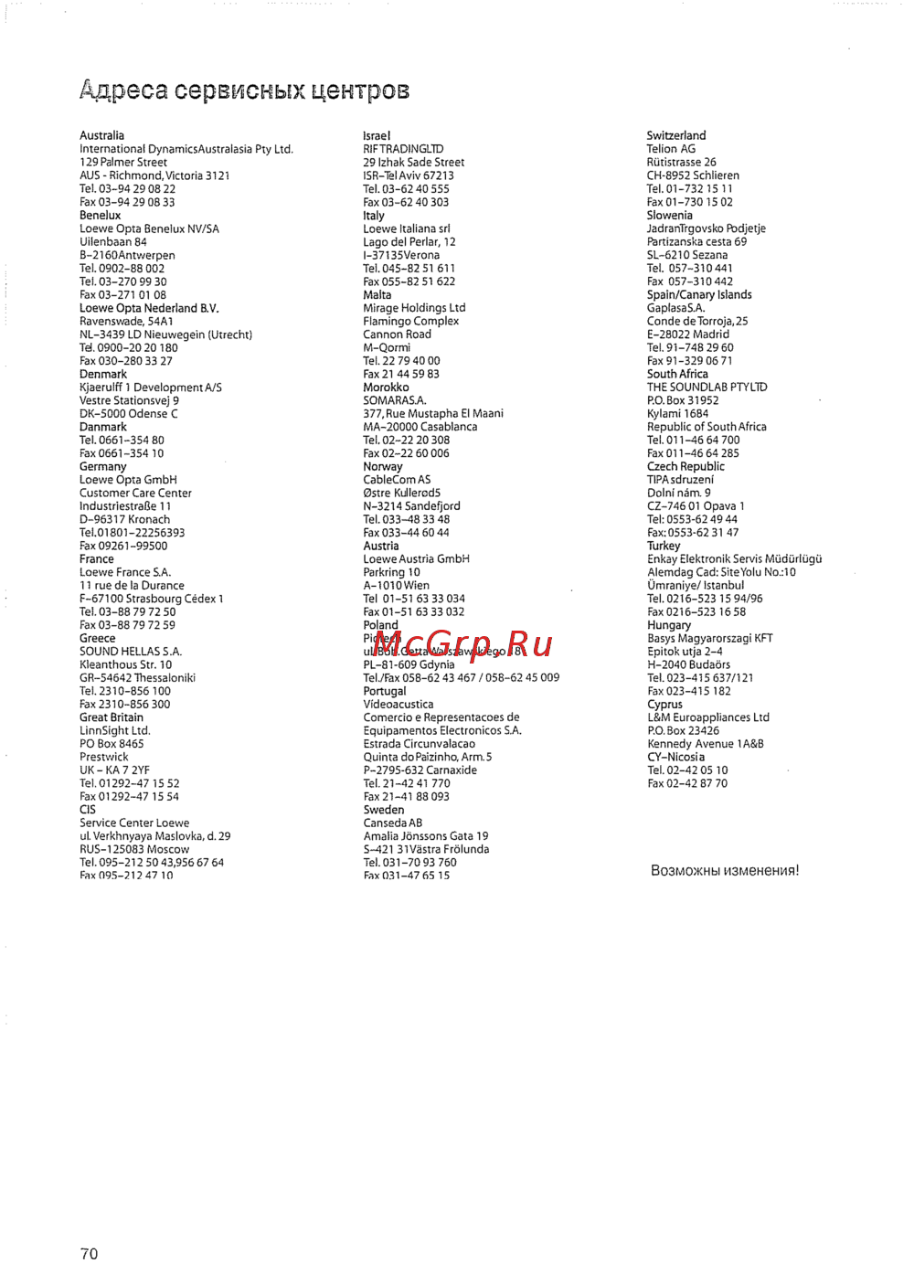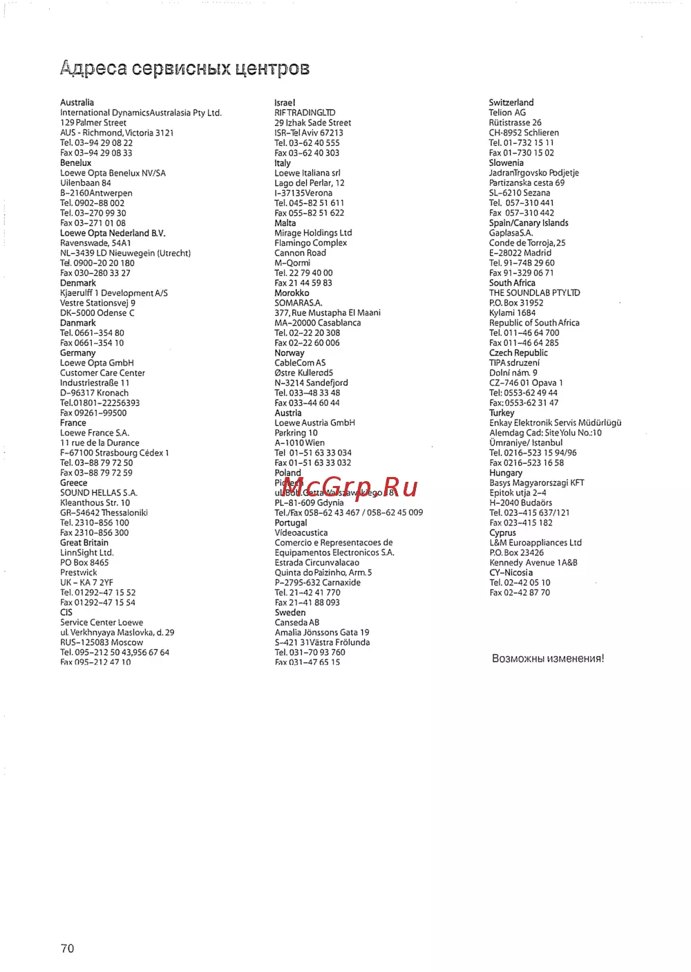Адреса сервисных центров Australia Internationa DynamicsAustralasia Pty Ltd 129 Palmer Street AUS Richmond Victoria 3121 Tel 03 94 29 08 22 Fax 03 94 29 08 33 Benelux Loewe Opta Benelux NV SA Uüenbaan 84 B 2160Antwerpen Tel 0902 88 002 Tel 03 270 99 30 Fax 03 271 01 08 Loewe Opta Nederland B V Ravenswade 54A1 NL 3439 LD Nieuwegein Utrecht Tel 0900 20 20 180 Fax 030 280 33 27 Denmark Kjaeruiff 1 DevelopmentA S Vestre Stationsvej 9 DK 5000 Odense C Danmark Tel 0661 354 80 Fax 0661 354 10 Germany Loewe Opta GmbH Customer Care Center Industriestraße 11 D 96317 Kronach Tel 01801 22256393 Fax 09261 99500 France Loewe France S A 11 rue de la Durance F 67100 Strasbourg Cedex 1 Tel 03 88 79 72 50 Fax 03 88 79 72 59 Greece SOUND HELLAS S A Kleanthous Str 10 GR 54642 Thessaloniki Tel 2310 856 100 Fax 2310 856 300 Great Britain LinnSight Ltd PO Box 8465 Prestwick UK KA7 2YF Tel 01292 47 15 52 Fax 01292 47 15 54 CIS Service Center Loewe ul Verkhnyaya Maslovka d 29 RUS 125083 Moscow Tel 095 212 50 43 956 67 64 Fax 095 21247 10 70 Israel RIFTRADINGLTO 29 IzhakSade Street ISR Tel Aviv 67213 Tel 03 6240 555 Fax 03 62 40 303 Italy Loewe Italiana srl Lago del Perlar 12 l 37135Verona Tel 045 82 51 611 Fax 055 82 51 622 Malta Mirage Holdings Ltd Flamingo Complex Cannon Road M Qormi Tel 22 79 40 00 Fax 21 44 59 83 Morokko SOMARAS A 377 Rue Mustapha El Maani MA 20000 Casablanca Tei 02 22 20 308 Fax 02 22 60 006 Norway CableComAS 0stre Kullerod5 N 3214 Sandefjord Tel 033 48 33 48 Fax 033 44 60 44 Austria Loewe Austria GmbH Parkring 10 A 1010Wien Tel 01 51 63 33 034 Fax 01 51 63 33 032 Poland Piotech uL Boh GettaWarszawskiego 18 PL 81 609 Gdynia TeL Fax 058 62 43 467 058 62 45 009 Portugal Videoacustica Comercio e Representacoes de Equipamientos Electrónicos S A Estrada Circunvalacao Quinta doPaizinho Arm 5 P 2795 632 Carnaxide Tel 21 42 41 770 Fax 21 41 88 093 Sweden CansedaAB Amalia Jonssons Gata 19 S 421 31Vastra Frólunda Tel 031 70 93 760 Fax 031 47 65 15 Switzerland Telion AG Riitistrasse 26 CH 8952 Schlieren Tel 01 732 15 11 Fax 01 730 15 02 Slowenia JadranTrgovsko Pbdjetje Partizanska cesta 69 SL 6210Sezana Tel 057 310 441 Fax 057 310 442 Spaln Canary Islands GaplasaSA Conde deTorroja 25 E 28022 Madrid Tel 91 748 29 60 Fax91 329 0671 South Africa THE SOUNDLAB PTYL1D P O Box 31952 Kylami 1684 Republic of South Africa Tel 011 46 64 700 Fax 011 46 64 285 Czech Republic TIPAsdruzeni Dolninam 9 CZ 746 01 Opava 1 Tel 0553 62 49 44 Fax 0553 62 31 47 Turkey Enkay Ele kt ron i k Servis Miidurlugu Alemdag Cad SiteYolu No 10 Umraniye Istanbul Tel 0216 523 15 94 96 Fax 0216 523 16 58 Hungary Basys Magyarorszagi KFT Epitok utja 2 4 H 2040 Budadrs Tel 023 415 637 121 Fax 023 415 182 Cyprus L M Euroappliances Ltd P O Box 23426 Kennedy Avenue 1A B CY Nicosia Tel 02 42 05 10 Fax 02 42 87 70 Возможны изменения