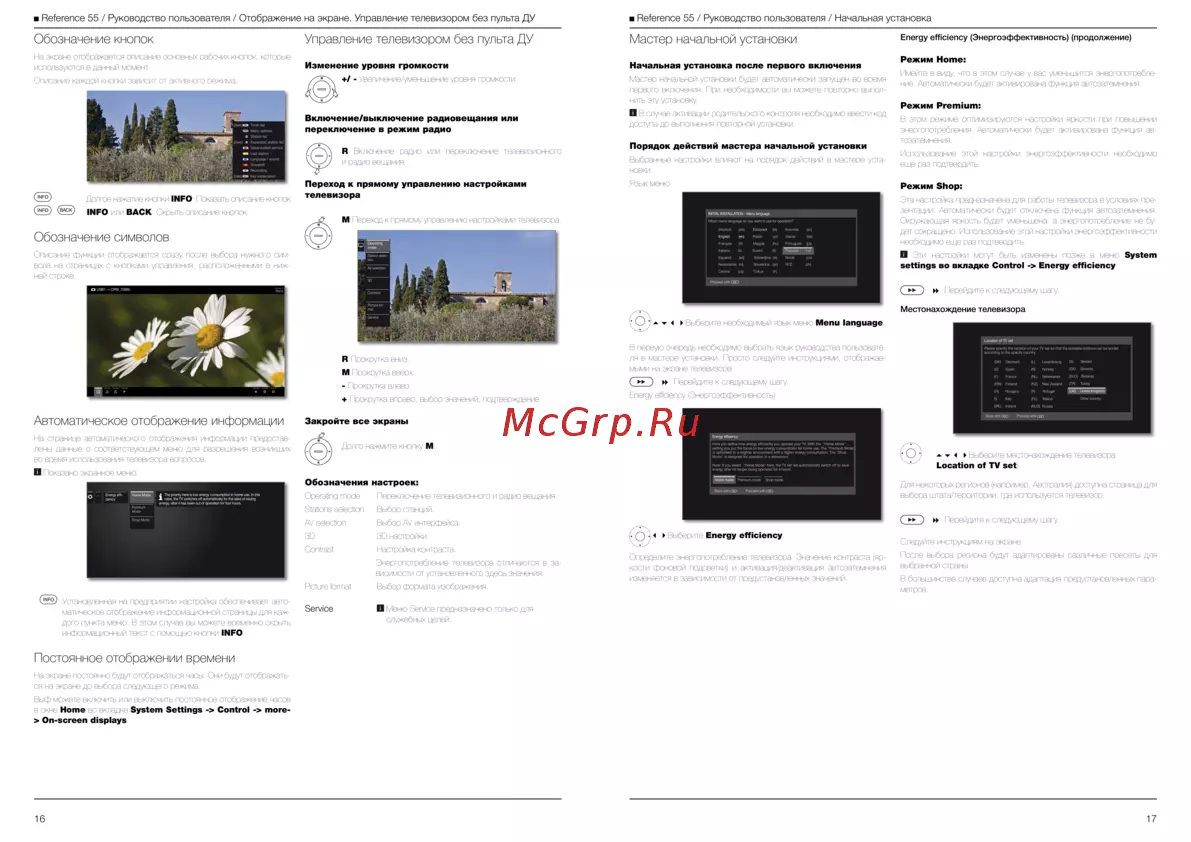 Reference 55 / Руководство пользователя / Начальная установка Reference 55 / Руководство пользователя / Отображение на экране. Управление телевизором без пульта ДУ