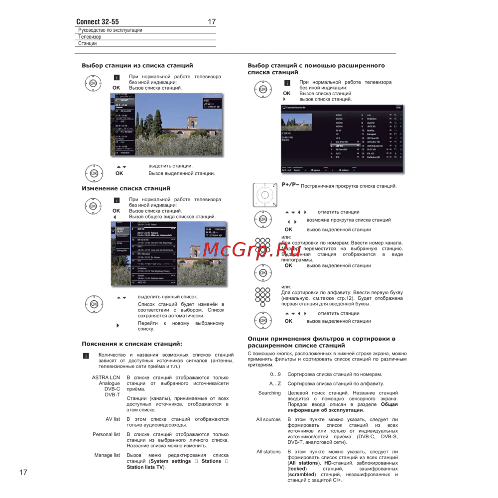 Connect 32 55 17 Руководство по эксплуатации Телевизор________________ Станции Выбор станции из списка станций Выбор станций с помощью расширенного списка станций При нормальной работе телевизора без иной индикации ОК Вызов списка станций Ц ОК выделить станции ОК Вызов выделенной станции При нормальной работе без иной индикации Вызов списка станций вызов списка станций телевизора Р Р Постраничная прокрутка списка станций Изменение списка станций л ж 4 отметить станции в ОК возможна прокрутка списка станций вызов выделенной станции или Для сортировки по номерам Ввести номер канала Маркер переместится на выбранную станцию Выделенная станция отображается в виде пиктограммы ОК вызов выделенной станции или Для сортировки по алфавиту Ввести первую букву начальную см также стр 12 Будет отображена первая станция для введённой буквы выделить нужный список Список станций будет изменён в соответствии с выбором Список сохраняется автоматически Перейти списку к новому Опции применения фильтров и сортировки в расширенном списке станций Пояснения к спискам станций Ц Количество и названия возможных списков станций зависят от доступных источников сигналов антенны телевизионные сети приёма и т п ASTRA LCN Analogue DVB C DVB T 17 В списке станций отображаются только станции от выбранного источи и ка сети приёма list В этом списке станций только аудиовидеовходы Personal list В списке станций отображаются только станции из выбранного личного списка Название списка можно изменить list С помощью кнопок расположенных в нижней строке экрана можно применять фильтры и сортировать список станций по различным критериям 0 9 Сортировка списка станций по номерам A Z Сортировка списка станций по алфавиту Searching Целевой поиск станций Название станций вводится с помощью сенсорного экрана Порядок ввода описан в разделе Общая информация об эксплуатации All sources В этом пункте можно указать следует ли формировать список станций из всех источников или только от индивидуальных источников сетей приёма DVB C DVB S DVB T аналоговой сети Станции каналы принимаемые от всех доступных источников отображаются в этом списке AV Manage л отметить станции ОК вызов выделенной станции выбранному Вызов меню станций System Station lists TV отображаются редактирования списка settings Stations All stations В этом пункте можно указать следует ли формировать список станций из всех станций All stations HD станций заблокированных locked станций зашифрованных scrambled станций незашифрованных и станций с защитой CI