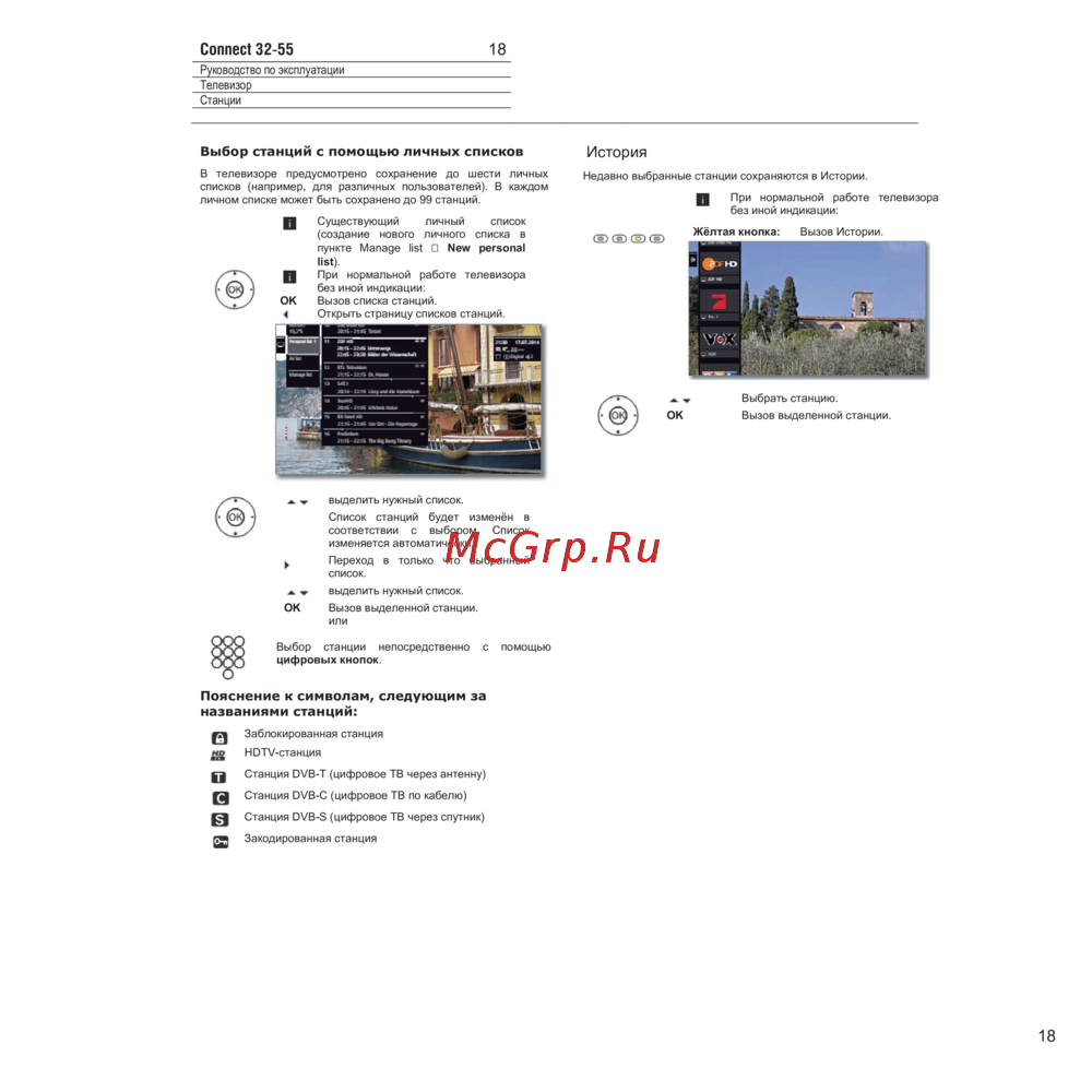 Connect 32 55 18 Руководство no эксплуатации Телевизор Станции Выбор станций с помощью личных списков В телевизоре предусмотрено сохранение до шести списков например для различных пользователей В личном списке может быть сохранено до 99 станций История личных каждом Недавно выбранные станции сохраняются в Истории п При нормальной работе телевизора без иной индикации Существующий личный список создание нового личного списка в пункте Manage list New personal list При нормальной работе телевизора без иной индикации Вызов списка станций Открыть страницу списков станций Жёлтая кнопка Вызов Истории Выбрать станцию ОК Вызов выделенной станции л выделить нужный список Список станций будет изменён в соответствии с выбором Список изменяется автоматически Переход в только что выбранный список л выделить нужный список ОК Вызов выделенной станции или Выбор станции непосредственно с помощью цифровых кнопок Пояснение к символам следующим за названиями станций Q Заблокированная станция до HDTV станция g Станция DVB T цифровое ТВ через антенну в Станция DVB С цифровое ТВ по кабелю 0 Станция DVB S цифровое ТВ через спутник ру Закодированная станция 18