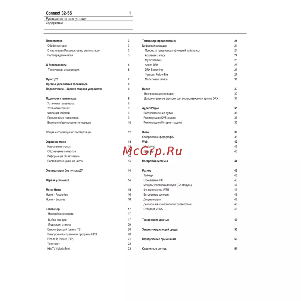 1 Connect 32 55 Руководство no эксплуатации Содержание Приветствие 3 Телевизор продолжение 24 Объём поставки 3 Цифровой рекордер О настоящем Руководстве по эксплуатации 3 Просмотр телевизора с функцией тайм шифт 24 Подтверждение прав 3 Архивная занизь 24 О безопасности Техническая информация 24 Мультизапись 25 4 Архив DR 26 5 DR Streaming 27 Пульт ДУ 7 Органы управления телевизора 8 Подключение Задняя сторона устройства 9 Видео Функция Folow Me 27 Мобильная запись 31 32 Воопрэизведение видео 30 Даюгнительные фунщии для воспроизведения архива DR 31 Подготовка телевизора 9 Установка телевизора 9 Установка крышек 9 АудиоФадио Фиксация кабелей 9 Подключение телевизора 9 Режим радио DVB радио 37 Включение выключение телевизора 10 Режим радио Интернет радио 35 Обиря информация об эксплуатации 12 Экранное меню 14 Воспрсмзведение аудио Фото 35 36 36 Отображение фотографий 38 Web 42 Назначение молок 14 Media Net 42 Обозначение символов 14 Браузер 43 Информация об автоменю 14 Постоянная индикация часов 14 Настройки системы 14 Разное Эксплуатация без пульта ДУ Таймер Первая установка 14 Обновление ПО Модуль условного доступа СА модуль 44 45 45 46 47 Меню Ноте 16 Функция кнопки WEB 47 Ноте Favourites 16 Встроенные функции 48 Ноте Sources 16 Документация 48 Декла рация изготовителя соответствия Телевизор 17 Настройка громкости 17 Выбор станции 17 Индикация статуса 20 Слисок функций режим ТВ 20 Электронный сяравснник программ EPG 20 Picture in Picture PIP 21 Телетекст 22 HbbTV MediaText 23 Стандарт VESA 48 48 Технические данные 49 Защита окружающей среды 50 Юридические примечания 50 Сервисные центры 51