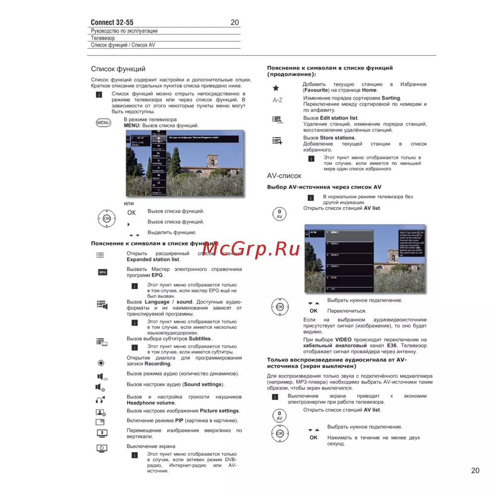 Connect 32 55 20 Руководство по эксплуатации Телевизор Список функций Список АУ Пояснение к символам в списке функций продолжение Список функций Список функций содержит настройки и дополнительные опции Краткое описание отдельных пунктов списка приведено ниже д Список функций можно открыть непосредственно в режиме телевизора или через список функций В зависимости от этого некоторые пункты меню могут быть недоступны Добавить текущую станцию в Избранное Favourite на странице Ноте д_2 Изменение порядка сортировки Sorting Переключение между сортировкой по номерам и по алфавиту Вызов Edit station list Удаление станций изменение порядка станций восстановление удалённых станций Вы зов Store statl ons Добавление текущей станции в список избранного g Этот пункт меню отображается только в том случае если имеется по меньшей мере один список избранного AV список Выбор AV источника через список AV g В нормальном режиме телевизора без другой индикации Открыть список станций AV list ОК Вызов списка функций Вызов списка функций Выделить функцию Пояснение к символам в списке функций Открыть расширенный список станций Expanded station list Вызвать Мастер электронного справочника программ EPG Ч П Этот пункт меню отображается только в том случае если мастер EPG ещё не был вызван Вызов Language sound Доступные аудиоформаты и их наименования зависят от транслируемой программы Выбрать нужное подключение ОК Переключиться Если на присутствует видимо g Этот пункт меню отображается только в том случае если имеется несколько языков аудиодорожек Вызов выбора субтитров Subtitles g Этот пункт меню отображается только в том случае если имеется субтитры Открытие диалога для программирования записи Recording Вызов режима аудио количество динамиков Io а Вызов настроек аудио Sound settings Вызов и настройка грокости наушников Headphone volume Вызов настроек изображения Picture settings а Включение режима PIP картинка в картинке Перемещение изображения вверх вниз по вертикали Выключение экрана д Этот пункт меню отображается только в случае если активен режим ОУВрадио Интернет радио или АУисточник выбранном аудиовидеоисточнике сигнал изображение то оно будет При выборе VIDEO происходит переключение на кабельный аналоговый канал Е36 Телевизор отображает сигнал провайдера через антенну Только воспроизведение аудиосигнала от AVисточника экран выключен Для воспроизведения только звука с подключённого медиаплеера например МРЗ плеера необходимо выбрать АУ источники таким образом чтобы экран выключился Выключение экрана приводит к экономии электроэнергии при работе телевизора Открыть список станций AV list Выбрать нужное подключение ОК Нажимать в течение не менее двух секунд 20