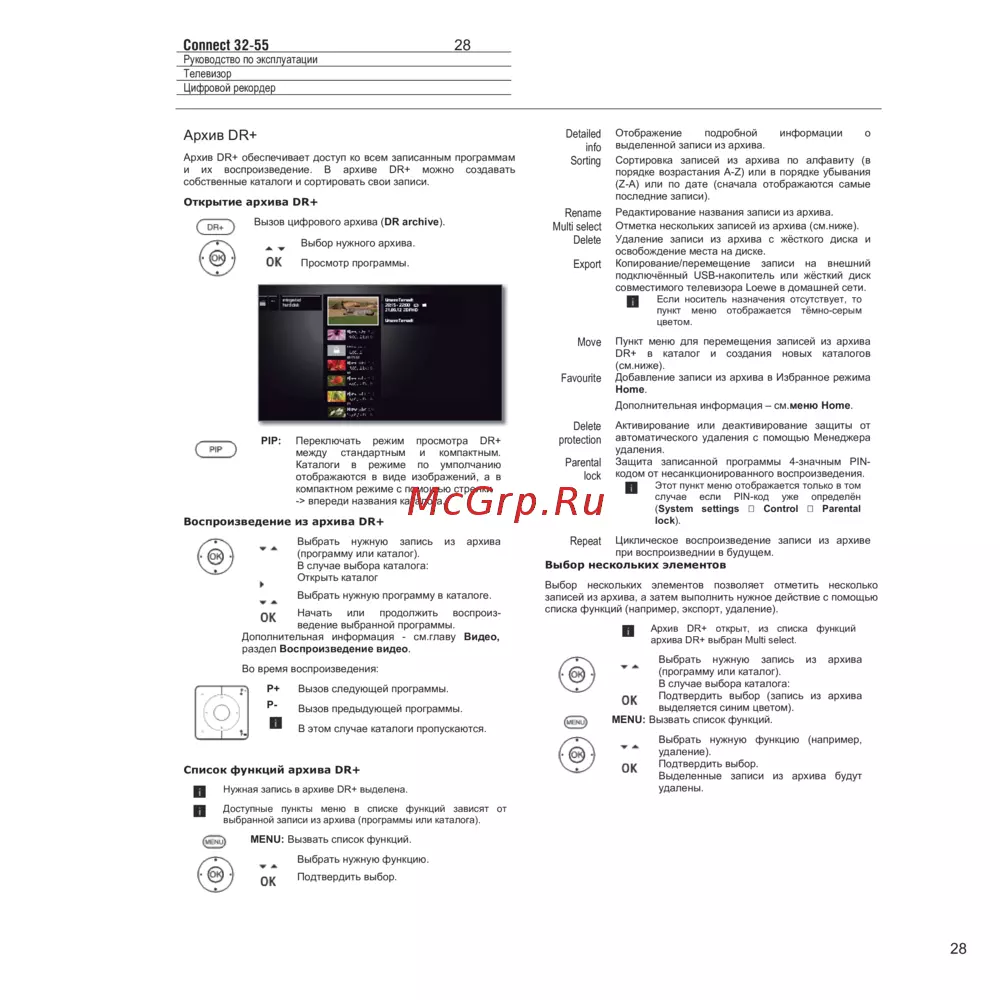 Connect 32 55________________________ 28 Руководство по эксплуатации_______________________________ Телевизор_______________________________________________ Цифровой рекордер Detailed Отображение подробной info выделенной записи из архива Архив ОР Архив ОР обеспечивает доступ ко всем записанным программам и их воспроизведение В архиве ОР можно создавать собственные каталоги и сортировать свои записи Sorting Открытие архива DR информации о Сортировка записей из архива по алфавиту в порядке возрастания A Z или в порядке убывания Z A или по дате сначала отображаются самые последние записи Rename Редактирование названия записи из архива Multi select Отметка нескольких записей из архива см ниже Delete Удаление записи из архива с жёсткого диска и освобождение места на диске Export Копирование перемещение записи на внешний подключённый USB накопитель или жёсткий диск совместимого телевизора Loewe в домашней сети Если носитель назначения отсутствует то пункт меню отображается тёмно серым цветом Вызов цифрового архива DR archive Выбор нужного архива ОК Просмотр программы g Move Пункт меню для перемещения записей из архива DR в каталог и создания новых каталогов см н иже Favourite Добавление записи из архива в Избранное режима Ноте Дополнительная информация см меню Ноте PIP Переключать режим просмотра DR меящу стандартным и компакгным Каталоги в режиме по умполчанию отображаются в виде изображений а в компактном режиме с помощью стрелки впереди названия каталога Воспроизведение из архива DR ж Выбрать нужную запись программу или каталог В случае выбора каталога Открыть каталог из архива Выбрать нужную программу в каталоге ОК Начать или продолжить воспроиз ведение выбранной программы Дополнительная информация см главу Видео раздел Воспроизведение видео Во время воспроизведения Вызов следующей программы Вызов предыдующей программы В этом случае каталоги пропускаются Список функций архива DR Ц Нужная запись в архиве 0Р выделена Delete protection Активирование или деактивирование защиты от автоматического удаления с помощью Менеджера удаления Parental Защита записанной программы 4 значным PINlock кодом от несанкционированного воспроизведения Этот пункт меню отображается только в том случае если PIN код уже определён System settings Control Parental lock g Repeat Циклическое воспроизведение при воспроизведнии в будущем записи из архиве Выбор нескольких элементов Выбор нескольких элементов позволяет отметить несколько записей из архива а затем выполнить нужное действие с помощью списка функций например экспорт удаление п Архив DR открыт из списка функций архива DR выбран Multi select Выбрать нужную запись из программу или каталог В случае выбора каталога QK Подтвердить выбор запись из архива выделяется синим цветом MENU Вызвать список функций архива Выбрать нужную функцию например удаление QK Подтвердить выбор Выделенные записи из архива будут удалены Доступные пункты меню в списке функций зависят от выбранной записи из архива программы ипи каталога MENU Вызвать список функций Выбрать нужную функцию QK Подтвердить выбор 28
