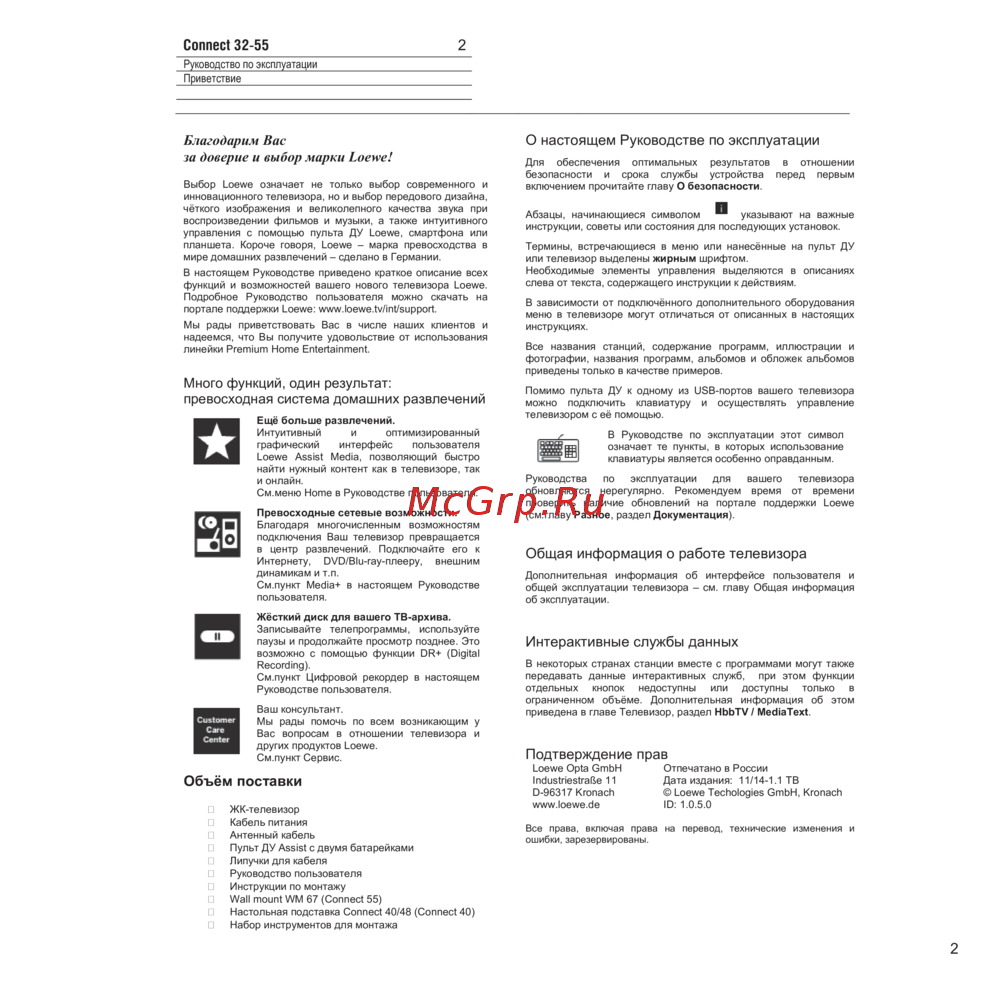 Connect 32 55 2 Руководство по эксплуатации Приветствие Благодарим Вас за доверие и выбор марки Loewe О настоящем Руководстве по эксплуатации Выбор Loewe означает не только выбор современного и инновационного телевизора но и выбор передового дизайна чёткого изображения и великолепного качества звука при воспроизведении фильмов и музыки а также интуитивного управления с помощью пульта ДУ Loewe смартфона или планшета Короче говоря Loewe марка превосходства в мире домашних развлечений сделано в Германии В настоящем Руководстве приведено краткое описание всех функций и возможностей вашего нового телевизора Loewe Подробное Руководство пользователя можно скачать на портале поддержки Loewe www loewe tv int support Мы рады приветствовать Вас в числе наших клиентов и надеемся что Вы получите удовольствие от использования линейки Premium Home Entertainment Много функций один результат превосходная система домашних развлечений Ещё больше развлечений Интуитивный и оптимизированный графический интерфейс пользователя Loewe Assist Media позволяющий быстро найти нужный контент как в телевизоре так и онлайн См меню Ноте в Руководстве пользователя 20 Превосходные сетевые возможности Благодаря многочисленным возможностям подключения Ваш телевизор превращается в центр развлечений Подключайте его к Интернету DVD Blu гау плееру внешним динамикам и т п См пункт Media в настоящем Руководстве пользователя Жёсткий диск для вашего ТВ архива Записывайте телепрограммы используйте паузы и продолжайте просмотр позднее Это возможно с помощью функции DR Digital Recording См пункт Цифровой рекордер в настоящем Руководстве пользователя Customer Саге Center Ваш консультант Мы рады помочь по всем возникающим Вас вопросам в отношении телевизора других продуктов Loewe См пункт Сервис Объём поставки ЖК телевизор Кабель питания Антенный кабель Пульт ДУ Assist с двумя батарейками Липучки для кабеля Руководство пользователя Инструкции по монтажу Wall mount WM 67 Connect 55 Настольная подставка Connect 40 48 Connect40 Набор инструментов для монтажа Для обеспечения оптимальных результатов безопасности и срока службы устройства включением прочитайте главу О безопасности в отношении перед первым Абзацы начинающиеся символом указывают на инструкции советы или состояния для последующих установок Термины встречающиеся в меню или нанесённые или телевизор выделены жирным шрифтом Необходимые элементы управления выделяются слева от текста содержащего инструкции к действиям важные на пульт ДУ в описаниях В зависимости от подключённого дополнительного оборудования меню в телевизоре могут отличаться от описанных в настоящих инструкциях Все названия станций содержание программ иллюстрации и фотографии названия программ альбомов и обложек альбомов приведены только в качестве примеров Помимо пульта ДУ к одному из USB портов вашего телевизора можно подключить клавиатуру и осуществлять управление телевизором с её помощью В Руководстве по эксплуатации этот символ В означает те пункты в которых использование клавиатуры является особенно оправданным Руководства по эксплуатации для вашего телевизора обновляются нерегулярно Рекомендуем время от времени проверять наличие обновлений на портале поддержки Loewe см главу Разное раздел Документация Общая информация о работе телевизора Дополнительная информация об общей эксплуатации телев