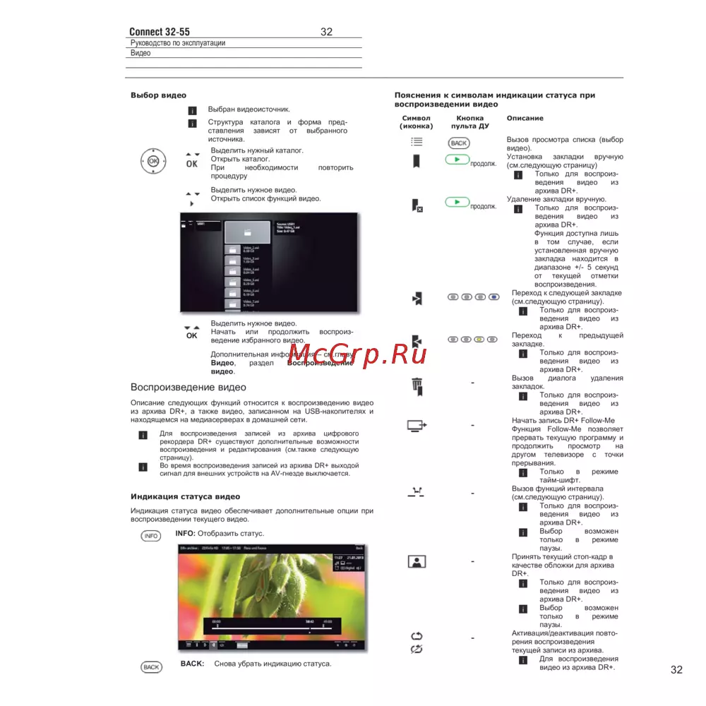 Connect 32 55 32 Руководство по эксплуатации Вццео Выбор видео д Выбран видеоисточник д Структура каталога и форма пред ставления зависят от выбранного источника Выделить нужный каталог Открыть каталог При необходимости повторить процедуру Пояснения к символам воспроизведении видео Символ иконка Кнопка пульта ДУ I индикации статуса при Описание Вызов просмотра списка выбор видео Установка закладки вручную см следующую страницу Только для воспроиз ведения видео из архива DR Удаление закладки вручную Только для воспроиз ведения видео из архива DR Функция доступна лишь в том случае если установленная вручную закладка находится в диапазоне 5 секунд от текущей отметки воспроизведения Переход к следующей закладке см следующую страницу Только для воспроиз ведения видео из архива 0Р Переход к предыдущей закладке д Только для воспроиз ведения видео из архива 0Р Вызов диалога удаления закладок Только для воспроиз ведения видео из архива 0Р Начать запись 0Р Follow Me Функция Follow Me позволяет прервать текущую программу и продолжить просмотр на другом телевизоре с точки прерывания Только в режиме тайм шифт Вызов функций интервала см следующую страницу Только для воспроиз ведения видео из архива Выбор возможен только в режиме паузы Принять текущий стоп кадр в качестве обложки для архива 0Р Только для воспроиз ведения видео из архива Выбор возможен только в режиме паузы Активация деактивация повто рения воспроизведения текущей записи из архива Для воспроизведения видео из архива ОР д Г д д Выделить нужное видео Начать или продолжить воспроиз ведение избранного видео о о Q3 Дополнительная информация см главу Видео раздел Воспроизведение видео Воспроизведение видео д Описание следующих функций относится к воспроизведению видео из архива ОР а также видео записанном на ОЗВ накопителях и находящемся на медиа серверах в домашней сети п Для воспроизведения записей из архива цифрового рекордера 0Р существуют дополнительные возможности воспроизведения и редактирования см также следующую страницу п Во время воспроизведения записей из архива 0Р выходой сигнал для внешних устройств на АУ гнезде выключается д Индикация статуса видео д Индикация статуса видео обеспечивает дополнительные опции при воспроизведении текущего видео д д д СО СО BACK Снова убрать индикацию статуса д 32