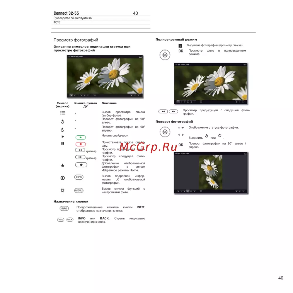 Connect 32 55 40 Руководство no эксплуатации Фото Полноэкранный режим Просмотр фотографий и Выделена фотография просмотр списка Описание символов индикации статуса при просмотре фотографий К Просмотр фото в полноэкранном режиме Символ Кнопка пульта Описание иконка ДУ Просмотр предыдущей следущей фото графии Вызов просмотра списка выбор фото Поворот фотографии на 90 влево Поворот фотографий Поворот фотографии на 90 вправо ж Отображение статуса фотографии Выделить или Ъ ó Начать слайд шоу 47 Приостановка показа слайдшоу Просмотр предыдущей фото графии Просмотр ел едущей фото графии Добавление отображаемой фотографии в список Избранное режима Ноте пи Поворот фотографии на 90 влево вправо Вызов подробной инфор мации об отображаемой фотографии Вызов списка функций настройками фото с Назначение кнопок Продолжительное нажатие кнопки INFO отображение назначения кнопок INFO BÂCK INFO ИЛИ BACK Скрыть назначения кнопок индикацию 40