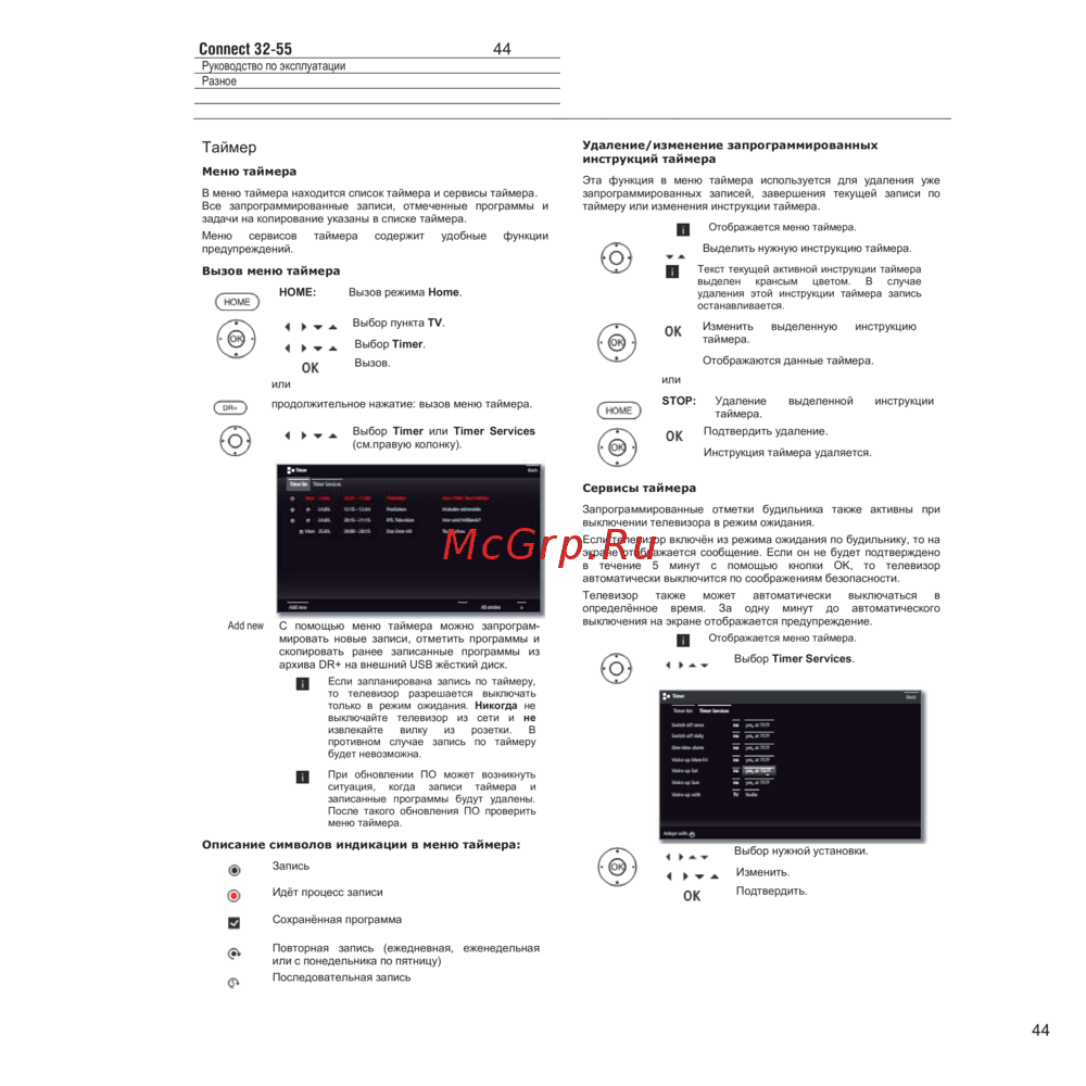 Connect 32 55 44 Руководство по эксплуатации Разное Удаление изменение запрограммированных инструкций таймера Таймер Меню таймера В меню таймера находится список таймера и сервисы таймера Все запрограммированные записи отмеченные программы и задачи на копирование указаны в списке таймера Меню сервисов таймера содержит удобные функции предупреждений Вызов меню таймера НОМЕ Эта функция в меню таймера используется для удаления уже запрограммированных записей завершения текущей записи по таймеру или изменения инструкции таймера Отображается меню таймера О Выделить нужную инструкцию таймера п Вызов режима Ноте Выбор пункта TV Текст текущей активной инструкции таймера выделен крансым цветом В случае удаления этой инструкции таймера запись останавливается Изменить выделенную инструкцию таймера ОК Выбор Timer ОК Отображаются данные таймера Вызов или или STOP продолжительное нажатие вызов меню таймера Выбор Timer или Timer Services см правую колонку Удаление выделенной инструкции таймера Подтвердить удаление ОК Инструкция таймера удаляется Сервисы таймера Запрограммированные отметки будильника выключении телевизора в режим ожидания также активны при Если телевизор включён из режима ожидания по будильнику то на экране отображается сообщение Если он не будет подтверждено в течение 5 минут с помощью кнопки ОК то телевизор автоматически выключится по соображениям безопасности Add new С помощью меню таймера можно запрограм мировать новые записи отметить программы и скопировать ранее записанные программы из архива DR на внешний USB жёсткий диск Д Д Если запланирована запись по таймеру то телевизор разрешается выключать только в режим ожидания Никогда не выключайте телевизор из сети и не извлекайте вилку из розетки В противном случае запись по таймеру будет невозможна Телевизор также может автоматически выключаться в определённое время За одну минут до автоматического выключения на экране отображается предупреждение Д Отображается меню таймера Выбор Timer Services О При обновлении ПО может возникнуть ситуация когда записи таймера и записанные программы будут удалены После такого обновления ПО проверить меню таймера Описание символов индикации в меню таймера Идёт процесс записи в Выбор нужной установки Запись Изменить ок Подтвердить Сохранённая программа Повторная запись ежедневная еженедельная или с понедельника по пятницу Последовательная запись 44