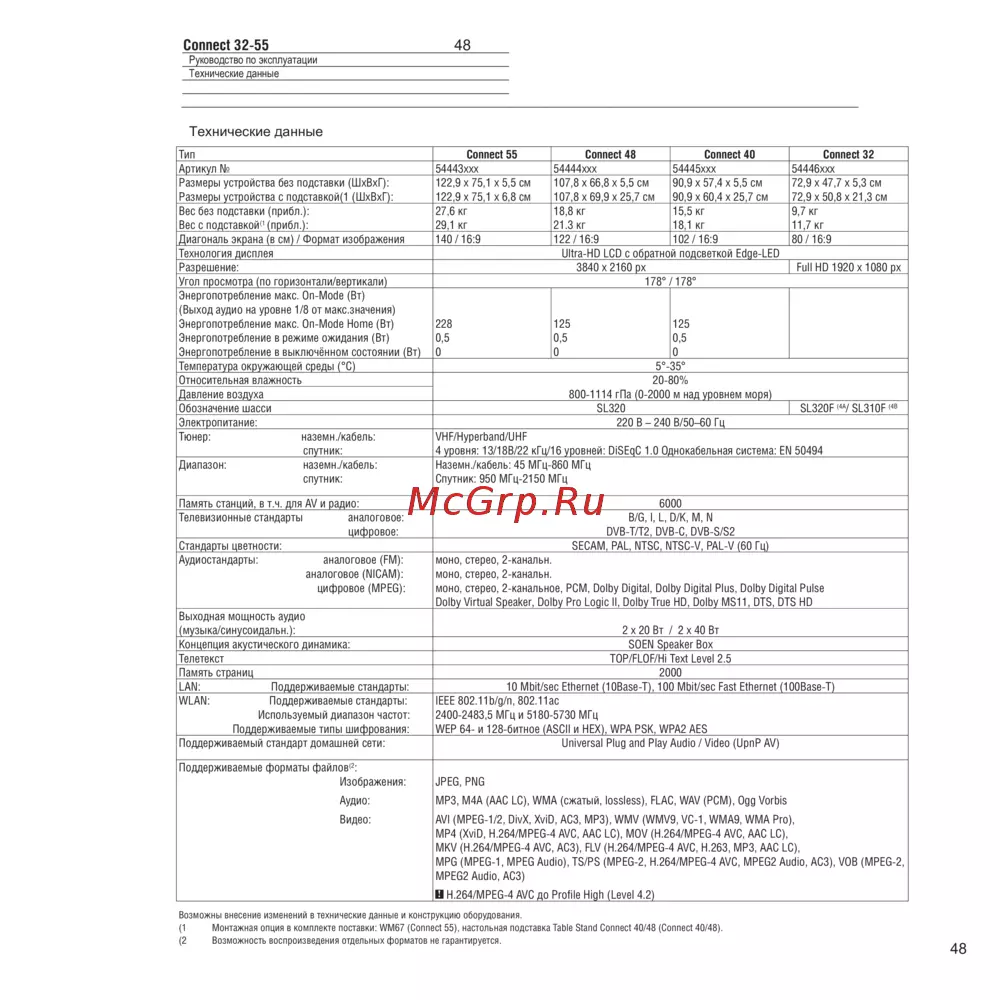 Connect 32 55______ 48 Руководство по эксплуатации Технические данные Т ехнические данные Тип Conned 55 Connect 48 Conned 40 Артикул Размеры устррйства без подставки ШхВхГ 54443ххх 122 9x75 1 X 5 5 см 54444XXX 107 8x66 8x5 5 CM 54445XXX 90 9x57 4 x5 5 см 54446ХХХ 72 9x47 7x5 3 см Connect 32 Размеры устррйства с подставкой 1 ШхВхГ Вес без педставки прибл 122 9x75 1 X 6 8 см 27 6 кг 107 8x69 9x25 7 CM 18 8 кг 90 9x60 4 x25 7 см 15 5 кг 72 9x50 8x21 3 см 9 7 кг Вес с подставкой прибл Диагрналь экрана в см Фермат изображения Технология дисплея 29 1 кг 140 16 9 21 3 кг 122 16 9 18 1 кг 102 16 9 11 7 кг 80 16 9 Ultra HD LCD с обратной подсветкой Edqe LED 3840x2160 рх Разрешение Угол просмотра ПР грризрнтали вертикали Энергопотребление макс On Mode Вт Выход аудио на уровне 1 8 от макс значения Энергопотребление макс On Mode Home Вт 228 125 125 Энергопотребление в режиме ржидания Вт Энергопртребление в выключенном состоянии Вт 0 5 0 0 5 0 0 5 0 Температура окружающей среды C Относительная влажность 5 35 20 80 800 1114 гПа 0 2000 м над уровнем мпря Давление воздуха Обозначение шасси SL320 SL320F SLSIOF Электропитание Тюнер наземн кабель VHF Hyperband UHF Диапазон спутник наземн кабель 4 уровня 13 18В 22 кГц 16 уровней DiSEqC 1 0 Однокабельная система EN 50494 Наземн кабель 45 МГц 860 МГц спутник Спутник 950 МГц 2150 МГц 220 В 240 В 50 60 Гц Память станций в т ч для AV и радио Телевизионные стандарты 6000 аналрговое цифровое В G I L D К М N DVB T T2 DVB С DVB S S2 SECAM PAL NTSC NTSC V PAL V 60 Гц Стандарты цветности Аудиостандарты аналрговое FM аналоговое NICAM цифровое MPEG моно стерео 2 канальн моно стерео 2 канальн моно стерео 2 канальное РСМ Dolby Digital Dolby Digital Plus Dolby Digital Pulse Dolby Virtual Speaker Dolby Pro Logic II Dolby True HD Dolby MS11 DTS DTS HD Выходная мощность аудио музыка синусоидальн 2x20Вт 2x40Вт Концепция акустического динамика Телетекст Память страниц LAN WLAN Full HD 1920x1080 рх 178 178 SOEN Speaker Box TOP FLOF Hi Text Leyel 2 5 2000 10 Mbit sec Ethernet 10Base T WOMbiVsec Fast Ethernet 100Base T Поддерживаемые стандарты Поддерживаемые стандарты Используемый диапазон частот IEEE 802 11b g n 802 11ac 2400 2483 5 МГц и 5180 5730 МГц Поддерживаемыетипы шифрования Поддерживаемый стандарт демашней сети WEP 64 и 128 битное ASCII и HEX WPA PSK WPA2 AES Universal Plug and Play Audio Video UpnPAV Поддерживаемые ферматы файлрв Изображения JPEG PNG Аудио MP3 M4A AAC LC WMA сжатый lossless FLAC WAV PCM Ogg Vorbis Видео AVI MPEG 1 2 DivX XviD AC3 MP3 WMV WMV9 VC 1 WMA9 WMA Pro MP4 XviD H 264 MPEG 4 AVC AAC LC MOV H 264 MPEG 4 AVC AAC LC MKV H 264 MPEG 4 AVC AC3 FLV H 264 MPEG 4 AVC H 263 MP3 AAC LC MPG MPEG 1 MPEG Audio TS PS MPEG 2 H 264 MPEG 4 AVC MPEG2 Audio AC3 VOB MPEG 2 MPEG2 Audio AC3 UH 264 MPEG 4 AVC до Profile High Level 42 Возможны внесение изменений в технические данные и конструкцию оборудования 1 Монтажная опция в комплекте поставки WM67 Connect 55 настольная подставка Table Stand Connect 40 48 Connect 40 48 2 Возможность воспроизведения отдельных форматов не гарантируется 48