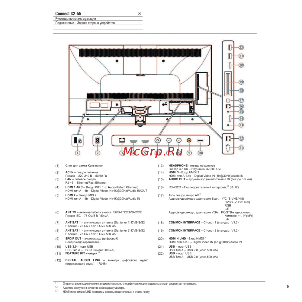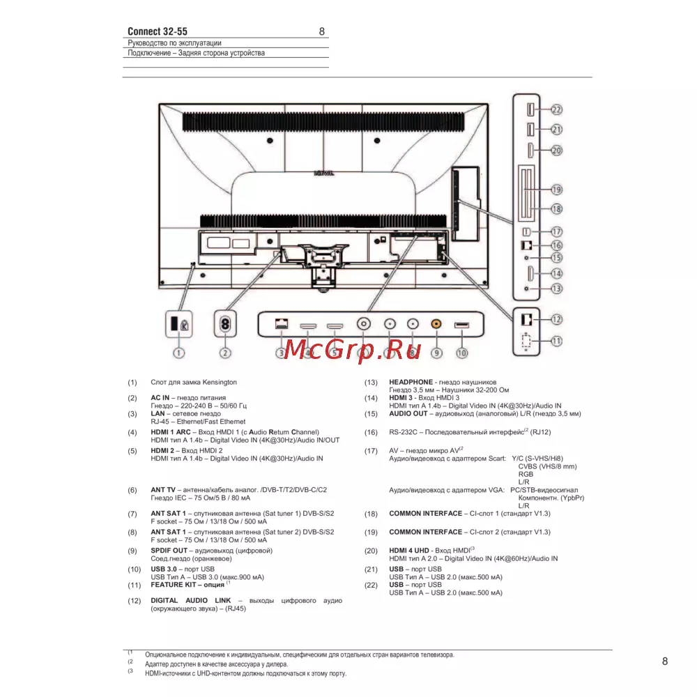Connect 32 55 8 Руководство по эксплуатации_____________ Подключение Задняя сторона устройства 1 Слот для замка Kensington 2 AC IN гнездо питания Гнездо 220 240 В 50 60 Гц 3 LAN сетевое гнездо RJ 45 Ethernet Fast Ethernet 13 HEADPHONE гнездо наушников Гнездо 3 5 мм Наушники 32 200 Ом 14 HDMI 3 Вход HMDI 3 HDMI тип A 1 4b Digital Video IN 4K 30Hz Audio IN 15 AUDIO OUT аудиовыход аналоговый L R гнездо 3 5 мм RS 232C Последовательный интерфейс 2 RJ12 4 HDMI 1 ARC Вход HMDI 1 с Audio Return Channel HDMI тип A 1 4b Digital Video IN 4K 30Hz Audio IN OUT 16 5 HDMI 2 Вход HMDI2 HDMI тип A 1 4b Digital Video IN 4K 30Hz Audio IN 17 AV гнездо микро AV 2 Аудис видеовход с адаптером Scart Y C S VHS Hi8 CVBS VHS 8 mm RGB UR Аудис видеовход с адаптером VGA PC STB видеосигнал Компонентн YpbPr UR 18 COMMON INTERFACE Cl cnor 1 стандарт V1 3 6 ANT TV антенна кабель аналог DVB T T2 DVB C C2 Гнездо IEC 75 Ом 5 В 80 мА 7 ANT SAT 1 спутниковая антенна Sat tuner 1 DVB S S2 F socket 75 Ом 13 18 Ом 500 мА 8 ANT SAT 1 спутниковая антенна Sat tuner 2 DVB S S2 F socket 75 Ом 13 18 Ом 500 мА 19 COMMON INTERFACE Cl cnor 2 стандарт V1 3 9 20 HDMI 4 UHD Вход HMDI 3 HDMI тип A 2 0 Digital Video IN 4K 60Hz Audio IN S PDI F OUT аудиовыход цифровой Соед гнездо оранжевое 10 USB 3 0 порт USB USB Тип А USB 3 0 макс 900 мА 11 FEATURE KIT опция 21 USB порт USB USB Тип A USB 2 0 макс 500 мА 22 USB порт USB USB Тип A USB 2 0 макс 500 мА 12 DIGITAL AUDIO LINK выходы цифрового аудио окружающего звука RJ45 1Опциональное лэдключэние к индивидуальным специфическим для отдельных стран вариантов телевизора Адаптер доступен в качестве аксессуара у дилера 3 НОМ1 источниш с инО контентом должны подключаться к этому порту 2