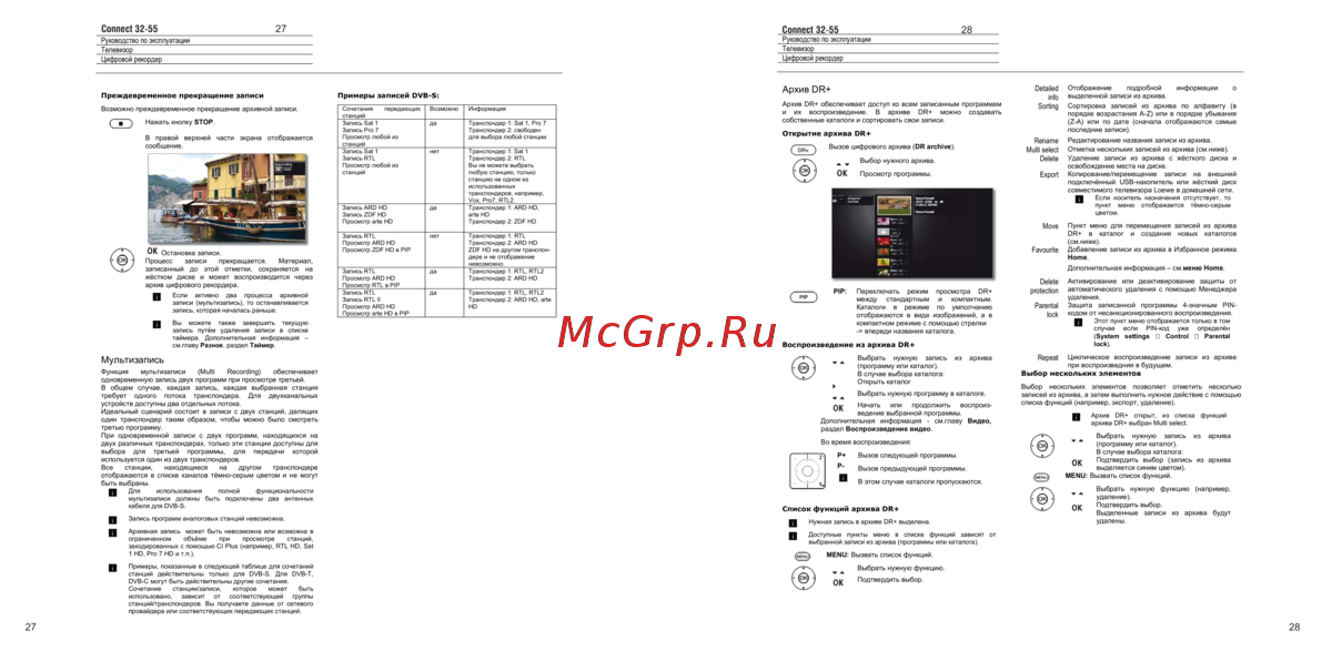 Connect 32 55 27 Connect 32 55____________________________________ 28 Руководство no эксплуатации Руководство по эксплуатации_______________________________ Телевизор Телевизор_______________________________________________ Цифровой рекордер Цифровой рекордер Преждевременное прекращение записи Возможно преждевременное прекращение архивной записи Нажать кнопку STOP В правой верхней части экрана отображается сообщение ОК Остановка записи Процесс записи прекращается Материал записанный до этой отметки сохраняется на жёстком диске и может воспроизводится через архив цифрового рекордера Если активно два процесса архивной записи мультизапись то останавливается запись которая началась раньше Вы можете также завершить текущую запись путём удаления записи в списке таймера Допопнитепьная информация см главу Разное раздел Таймер Сочетания передающи станций Запись Sat 1 Запись Pro 7 Просмотр любой из станций Запись Sat 1 Запись RTL Просмотр любой из станций Возмо ио Информация Да I ранспсн дер 1 Sat 1 Pro 1 Транспондер 2 свободен для выбора любой станции нет Запись ARD HD Запись ZDF HD Просмотр arte HD да Запись RTL Просмотр ARD HD Просмотр ZDF HD в PIP нет Запись RTL Просмотр ARD HD Просмотр RTL в PIP Запись RTL Запись RTL II Просмотр ARD HD Просмотр arte HD в PIP да да Архив 0Р обеспечивает доступ ко всем записанным программам и их воспроизведение В архиве ОР можно создавать собственные каталоги и сортировать свои записи g Запись программ аналоговых станций невозможна g Архивная запись может быть невозможна или возможна в ограниченном объёме при просмотре станций закодированных с помощью Cl Plus например RTL HD Sat 1 HD Pro 7 HD и т п g Примеры показанные в следующей таблице для сочетаний станций действительны только для DVB S Для DVB T DVB С могут быть действительны другие сочетания Сочетание станции записи которое может быть использовано зависит от соответствующей группы станций транспондеров Вы получаете данные от сетевого провайдера или соответствующих передающих станций 27 Sorting Открытие архива DR информации о Сортировка записей из архива по алфавиту в порядке возрастания A Z или в порядке убывания Z A или по дате сначала отображаются самые последние записи Rename Редактирование названия записи из архива Multi select Отметка нескольких записей из архива см ниже Delete Удаление записи из архива с жёсткого диска и освобождение места на диске Export Копирование перемещение записи на внешний подключённый USB накопитель или жёсткий диск совместимого телевизора Loewe в домашней сети Q Если носитель назначения отсутствует то пункт меню отображается тёмно серым цветом Транспсн дер 1 Sat 1 Транспсн дер 2 RTL Вы не можете выбрать любую станцию только станцию на одном из использованных транспондеров например Vox Pro7 RTL2 Трансгендер 1 ARD HD arte HD Трансгендер 2 ZDF HD Move Пункт меню для перемещения записей из архива DR в каталог и создания новых каталогов см ниже Favourite Добавление записи из архива в Избранное режима Ноше Трансгендер 1 RTL Трансгендер 2 ARD HD ZDF HD на друг см трансген дере и не отсбражение невозмоюю Трансгендер 1 RTL RTL2 Трансгендер 2 ARD HD Дополнительная информация см меню Ноте PIP Трансгендер 1 RTL RTL2 Трансгендер 2 ARD HD arte HD Переключать режим просмотра DR между стандартным и компактным Каталоги в режиме по умполчанию отображаются в виде изображений а в компактном режиме с помощью стрелки впереди названия каталога Воспроизведение из архива DR Мультизапись Функция мульти записи Multi Recording обеспечи