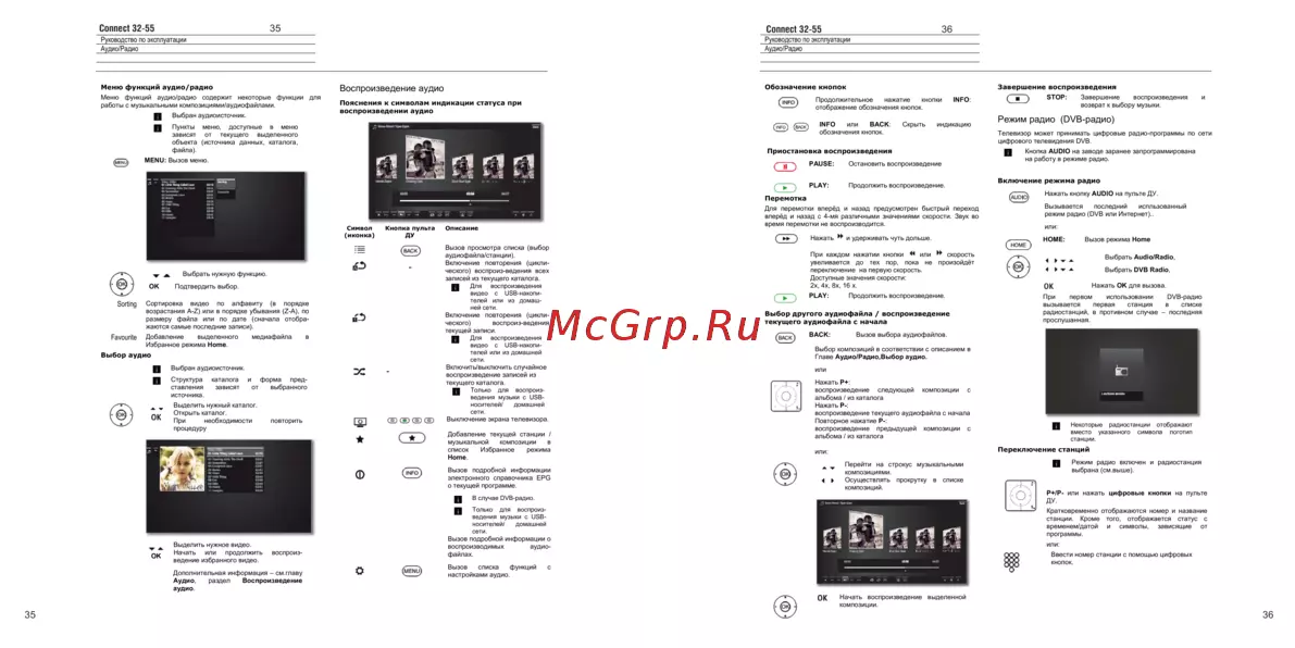 Connect 32 55 35 Connect 32 55 Руководство no эксплуатации 36 Руководство по эксплуатации Аудио Радио Аудио Радио Меню функций аудио радио Продолжительное нажатие кнопки INFO отображение обозначения кнопок Пояснения к символам индикации статуса при воспроизведении аудио g Выбран аудиоисточник Завершение воспроизведения и STOP Завершение воспроизведения и Обозначение кнопок Воспроизведение аудио Меню функций аудио радио содержит некоторые функции для работы с музыкальными композициями аудиофайлами INFO или BACK обозначения кнопок п Пункты меню доступные в меню зависят от текущего выделенного объекта источника данных каталога файла Скрыть возврат к выбору музыки индикацию Телевизор может принимать цифровые радио программы по сети цифрового телевидения DVB Приостановка воспроизведения MENU Вызов меню PAUSE С PLAY Остановить воспроизведение Продолжить воспроизведение Для перемотки вперёд и назад предусмотрен быстрый переход вперёд и назад с 4 мя различными значениями скорости Звук во время перемотки не воспроизводится Нажать ж Выбрать нужную функцию ОК Подтвердить выбор Sorting Favourite Сортировка видео по алфавиту в порядке возрастания A Z или в порядке убывания Z A по размеру файла или по дате сначала отобра жаются самые последние записи Добавление выделенного Избранное режима Ноте медиафайла в Выбор аудио g Выбран аудиоисточник g Структура каталога и форма пред ставления зависят от выбранного источника п Выделить нужный каталог J Открыть каталог При необходимости повторить процедуру Добавление текущей станции музыкальной композиции в список Избранное режима Ноте О Вызов подробной информации электронного справочника EPG о текущей программе и удерживать чуть дольше При каждом нажатии кнопки увеливается до тех пор пока переключение на первую скорость Доступные значения скорости 2х 4х 8х 16 х PLAY или скорость не произойдёт Продолжить воспроизведение BACK Дополнительная информация см главу Аудио раздел Воспроизведение Вызывается последний испльзованный режим радио DVB или Интернет или Вызов режима Ноте А Выбрать Audio Radio Выбрать DVB Radio ОК Нажать ОК для вызова При первом использовании вызывается первая станция радиостанций в противном случае прослушанная ОУВ радио в списке последняя Вызов выбора аудиофайлов Выбор композиций в соответствии с описанием в Главе Аудио Радио Выбор аудио или Нажать Р воспроизведение следующей композиции с альбома из каталога Нажать Р воспроизведение текущего аудиофайла с начала Повторное нажатие Р воспроизведение предыдущей композиции с альбома из каталога Переключение станций или ж 4 Перейти на строкус музыкальными композициями Осуществлять прокрутку в списке композиций д В случае ОУВ радио п Только для воспроиз Выделить нужное видео Начать или продолжить воспроиз ведение избранного видео Включение режима радио НОМЕ Выбор другого аудиофайла воспроизведение текущего аудиофайла с начала влек g Кнопка AUDIO на заводе заранее запрограммирована на работу в режиме радио Нажать кнопку AUDIO на пульте ДУ Перемотка Вызов просмотра списка выбор ауд иофа йла станции Включение повторения цикли ческого воспрои з ведения всех записей из текущего каталога н Для воспроизведения видео с USB накопителей или из домаш ней сети Включение повторения цикли ческого воспроиз ведения текущей записи g Для воспроизведения видео с USB накоп