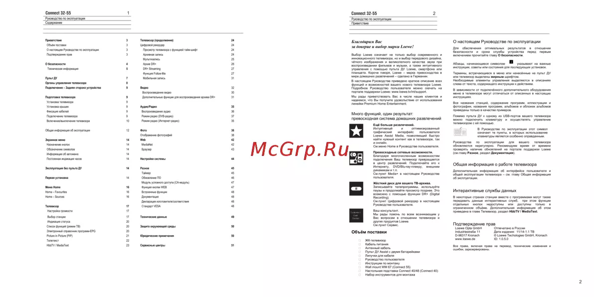 Connect 32 55 1 Connect 32 55 Руководство no эксплуатации______________________________ Содержание Приветствие Объём поставки Приветствие 3 Телевизор продолжение 24 3 Цифровой рекордер 24 0 настоящем Руководстве по эксплуатации 3 Просмотр телевизора с функцией тайм шифт 24 Подтверждение прав 3 Архивная запись 24 Мультизались 25 4 Архив DR 26 5 DR Streaming 27 0 безопасности Техническая информация Пульт ДУ 7 Органы управления телевизора 8 Подключение Задняя сторона устройства 9 2 Руководство по эксплуатации Фунщия Folow Me 27 Мобильная запись 31 Видео Воспроизведение видео Дспогнительные фунщии для воспроизведения архива DR 32 30 Подготовка телевизора 9 Установка телевизора 9 Установка крышек 9 Фиксация кабелей 9 Воспрсмзведение аудио 36 Подключение телевизора 9 Режим радио DVB радио 37 Включение выключение телевизора 10 Режим радио Интернет радио 35 Обиря информация об эксплуатации 12 Аудио Радио 31 Благодарим Вас за доверие и выбор марки Loewe Выбор Loewe означает не только выбор современного и инновационного телевизора но и выбор передового дизайна чёткого изображения и великолепного качества звука при воспроизведении фильмов и музыки а также интуитивного управления с помощью пульта ДУ Loewe смартфона или планшета Короче говоря Loewe марка превосходства в мире домашних развлечений сделано в Германии В настоящем Руководстве приведено краткое описание всех функций и возможностей вашего нового телевизора Loewe Подробное Руководство пользователя можно скачать на портале поддержки Loewe www loewe tv int support Мы рады приветствовать Вас в числе наших клиентов и надеемся что Вы получите удовольствие от использования линейки Premium Home Entertainment 35 Много функций один результат превосходная система домашних развлечений Ещё больше развлечений Экранное меню 14 Фото 36 Отображениэ фотографий 38 Web 42 Назначение топок 14 MediaNet 42 Обозначение символов 14 Браузер 43 Информация об автоменю 14 Постоянная индикация часов 14 Настройки системы 44 14 Разное 45 Интуитивный и оптимизированный графический интерфейс пользователя Loewe Assist Media позволяющий быстро найти нужный контент как в телевизоре так и онлайн См меню Ноте в Руководстве пользователя 2S 45 46 Модуль условного доступа СА модуль 47 Жёсткий диск для вашего ТВ архива Фунщия кнопки WEB 47 16 Встроенные функции 48 Ноте Sources 16 Документация 48 Декларация изготовителя соответствия 48 Телевизор 17 Стандарт VESA 48 Записывайте телепрограммы используйте паузы и продолжайте просмотр позднее Это возможно с помощью функции DR Digital Recording См пункт Цифровой рекордер в настоящем Руководстве пользователя Меню Ноте 16 Ноте Favourites Настройка громкости 17 Выбор станции 17 Индикация статуса 20 Слисок функций режим ТВ 20 Электронный справснник программ EPG 20 Picture in Picture PIP 21 Телетекст 22 HbbTV MediaText 23 Технические данные 49 Защита окружающей среды 50 Ваш консультант Мы рады помочь по всем возникающим у Вас вопросам в отношении телевизора и других продуктов Loewe См пункт Сервис Объём поставки Юридические примечания 50 Сервисные центры 51 Термины встречающиеся в меню или нанесённые или телевизор выделены жирным шрифтом Необходимые элементы управления выделяются слева от текста содержащего инструкции к действиям важные на пульт ДУ в описаниях В зависимости от подключённого дополнительного оборудования меню в телевизоре могут отличаться от описанных в настоящих инструкциях Все названия станций содержание программ илл
