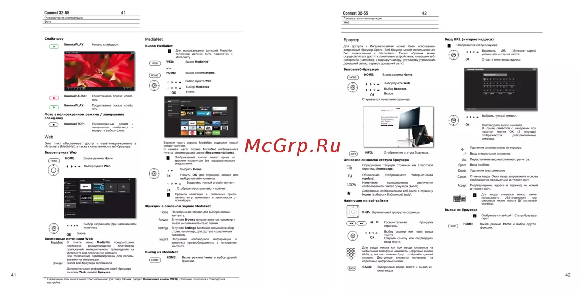 Connect 32 55 41 Connect 32 55 Руководство no эксплуатации Фото 42 Руководство по эксплуатации Web Слайд шоу MediaNet Кнопка PLAY Начало слайд шоу Ввод URL интернет адреса Браузер Вызов MediaNet g Для использования функций MediaNet телевизор должен быть подключён к Интернету WEB Вызов MediaNet Для доступа к Интернет сайтам может быть использован встроенный браузер Opera Веб браузер может использоваться без подключения к Интернету Таким образом может осуществляться доступ к локальным устройствам имеющим веб интерфейс например к маршрутизатору устройству управления домашней сетью серверу домашней сети Отображается статус браузера Выделить URL Интернет адрес указанного интернет сайта ОК Открыть окно ввода адреса Вызов веб браузера НОМЕ 4 Вызов режима Ноте Вызов режима Ноте ж л Выбор пункта Web Выбор пункта Web 4 Выбор MediaNet Выбор Browser Вызов Кнопка PAUSE Кнопка PLAY Вызов Приостановка показа слайдшоу Открывается начальная страница Продолжение показа слайдшоу Фото в полноэкранном режиме завершение слайд шоу жж и Кнопка STOP Полноэкранный режим ОК Подтвердить выбор символа завершение слайд шоу и возврат к выбору фото В случае символов с начерками при нажатии кнопки ОК 2 секунды отображаются дополнительные символы Web Этот пункт обеспечивает доступ к мультимедиа контенту в Интернете MediaNet а также к качественному веб браузеру Вызов пункта Web Верхняя часть экрана MediaNet содержит новый онлайн конте нт В нижней части экрана MediaNet отображаются пункты рекомендации Loewe Recommendations п Отображаемый контент может время от времени изменяться без предварительного уведомления Удаление символа слева от курсора Ввод специальных символов Нажать ОК для перехода вправо для выбора онлайн контента Выделить нужный онлайн контент Определение текущей страницы как Стартовой страницы homepage fi Обновление отображаемого Интернет сайта Изменение коэффициента увеличения отображаемого сайта браузера zoom Добавление отображаемого веб сайта Ноте в области Избранное add в Space Ввод пробела Delete Удаление всех символов Cancel Отмена ввода Окно ввода закрывается и снова отображается предыдущий интернет сайт update 100 Отобразить воспроизвести контент Правила навигации в различных прило жениях могут изменяться в зависимости от провайдера abc Переключение верхнего нижнего регистра Описание символов статуса браузера Выбрать Ноте страницу Навигация по веб сайтам Accept Подтверждение адреса и переход на новый интернет сайт g 14 Ш Функции в основном экране MediaNet Home Перемещение вправо для выбора онлайнконтента Выбор избранного при наличии или источника Вызов Возможные источники Web MediaNet В пункте меню MediaNet предсмотрена постоянно расширяющаяся платформа приложений интерактивного телевидения из Интернета см следующую колонку Все приложения оптимизированы для исполь зования на телевизоре Browser Вызов веб браузера телевизора Выбрать нужный символ НОМЕ Вызов режима Ноте и выбор другой функции Дополнительная информация о веб браузере см главу Web раздел Браузер 41 g Отображается веб сайт Статус браузера скрыт Горизонтальная страницы Settings В пункте Settings MediaNet возможен выбор стран например для доступа к различным сервисам Выход из MediaNet Выход из браузера Р Р Вертикальная прокрутка страницы Browse В пункте Browse осуществляется просмотр и вызов онлайн контента по темам Imprint Получение необходимой информации о законных правообладателях в о