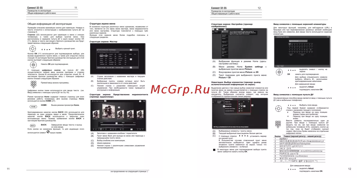 Connect 32 55 11 Connect 32 55 Руководство no эксплуатации Общая информация о работе меню 12 Руководство по эксплуатации Общая информация о работе меню Общая информация об эксплуатации Приведём описание важнейших кнопок для навигации Номера в тексте относятся к иллюстрации с изображением пульта ДУ на странице 9 Стрелки 22 используются для навигации в меню и списках телевизора а также для выбора пунктов меню Они расположены в середине пульта ДУ в круге вокруг кнопки ОК 11 Далее в тексте настоящего Краткого руководства они будут представлены следующим образом Структура экрана меню В основном структура различных меню одинакова независимо от того является ли это меню меню мастера меню медиаконтента или меню настройки Структура поясняется с помощью трёх различных экранов Функции этих экранов меню более подробно пояснены в следующих разделах Структура экрана Настройка пример изображение Ввод символов с помощью экранной клавиатуры Для некоторых функций например для веб адресов URL в браузере или при переименовании архивных записей необходим ввод букв или символов Для ввода текста используется экранная клавиатура Структура экрана Мастер Выбрать нужный пункт Кнопка ОК 11 используется для подтверждения выбора для вызова выделенного пункта меню а также для открытия списка станций В настоящем Кратком руководстве инструкции для этой кнопки выглядят следующим образом А Выбранная функция в режиме Ноте здесь настройки системы Нажать ОК для подтверждения С помощью цифровых кнопок на пульте ДУ 29 осуществляется прямой ввод каналов программ и страниц телетекста Кнопка 0 используется для открытия опций АУ В настоящем Кратком руководстве ввод с помощью цифровых кнопок показан следующим образом В Меню режима Home System settings с выбранным пунктом меню Picture С Фокусировка пунктов меню Picture на 3D В Выбранные пункты номера которых могут различными в зависимости от этапа действий С Нижняя строка с указанием имеющихся опций управления При необходимости также приводятся инструкции и информация Прямой ввод канала программы Цифровые кнопки также используются для ввода текста см Ввод символов с помощью пульта ДУ на стр 19 Режим просмотра Ноте содержит главную страницу для всех режимов работы телевизора Для вызова страницы Ноте используется кнопка НОМЕ 27 НОМЕ D Текст подсказки для выбранного пункта меню Picture 3D А Строка заголовков с названием мастера и текущим этапом действий быть Структура экрана Представление медиаконтента пример аудиоплеер Навигация Выбор элементов пример вывод вспомогательной информации на экран Выделение цветом и тем самым выбор символов элементов или пунктов меню на экране осуществляется с помощью стрелок на пульте ДУ Таким образом всегда видно где именно вы находитесь Выбранным считается элемент над которым отображается горизонтальная линия маркер Кратковременное нажатие кнопки BACK 24 используется для перехода на один уровень вверх в меню Продолжительное нажатие кнопки BACK используется к закрытию всех всплывающих меню Пример применения кнопки BACK в настоящем Кратком руководстве BACK Завершение ввода текста и выход из окна ввода Если кнопке не назначена функция то для индикации этого используется символ О выше справа ж выделить экране символ кнопку на ОК нажать для подтверждения Для выбора специального символа выбрать область 