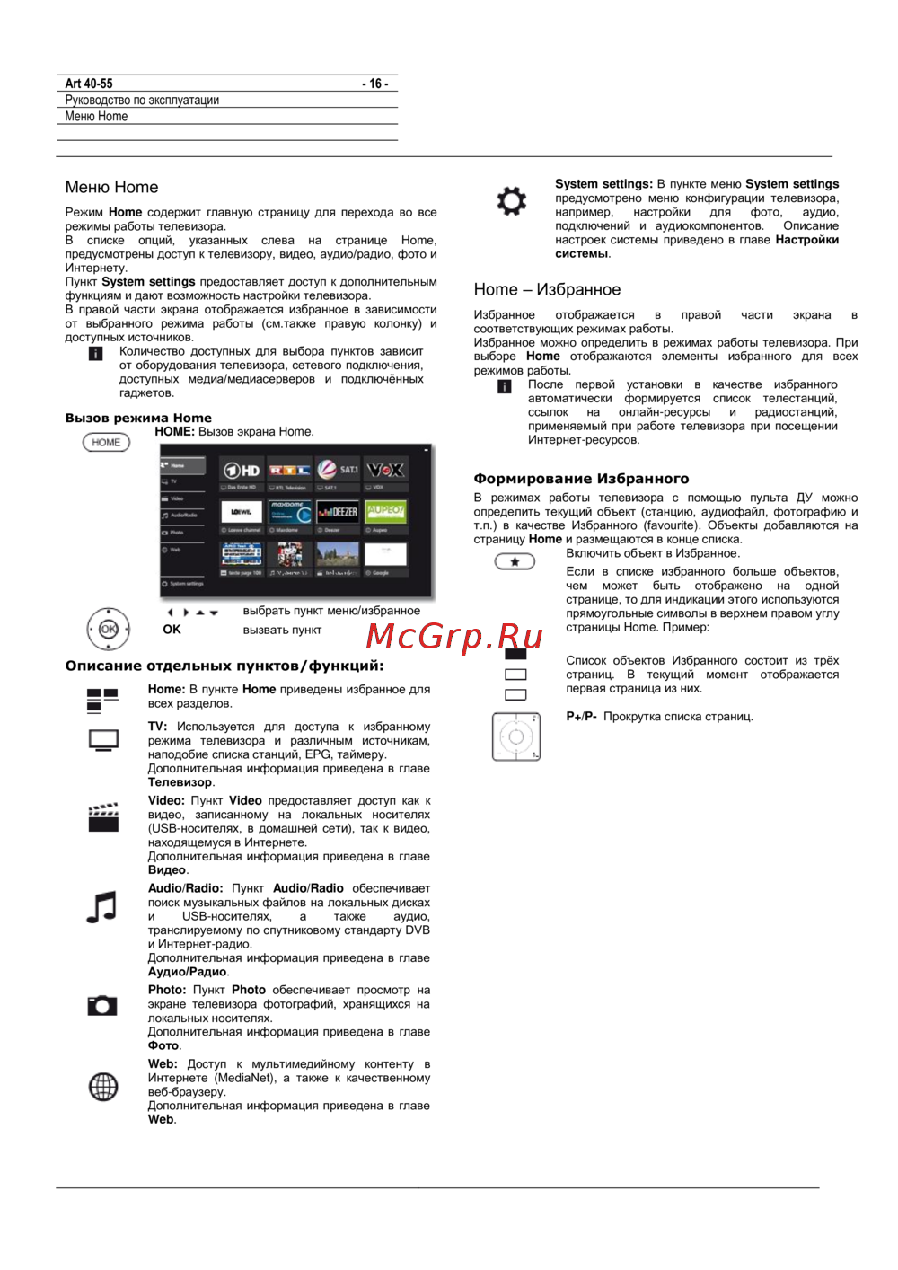 предусмотрены доступ к телевизору, видео, аудио/радио, фото и