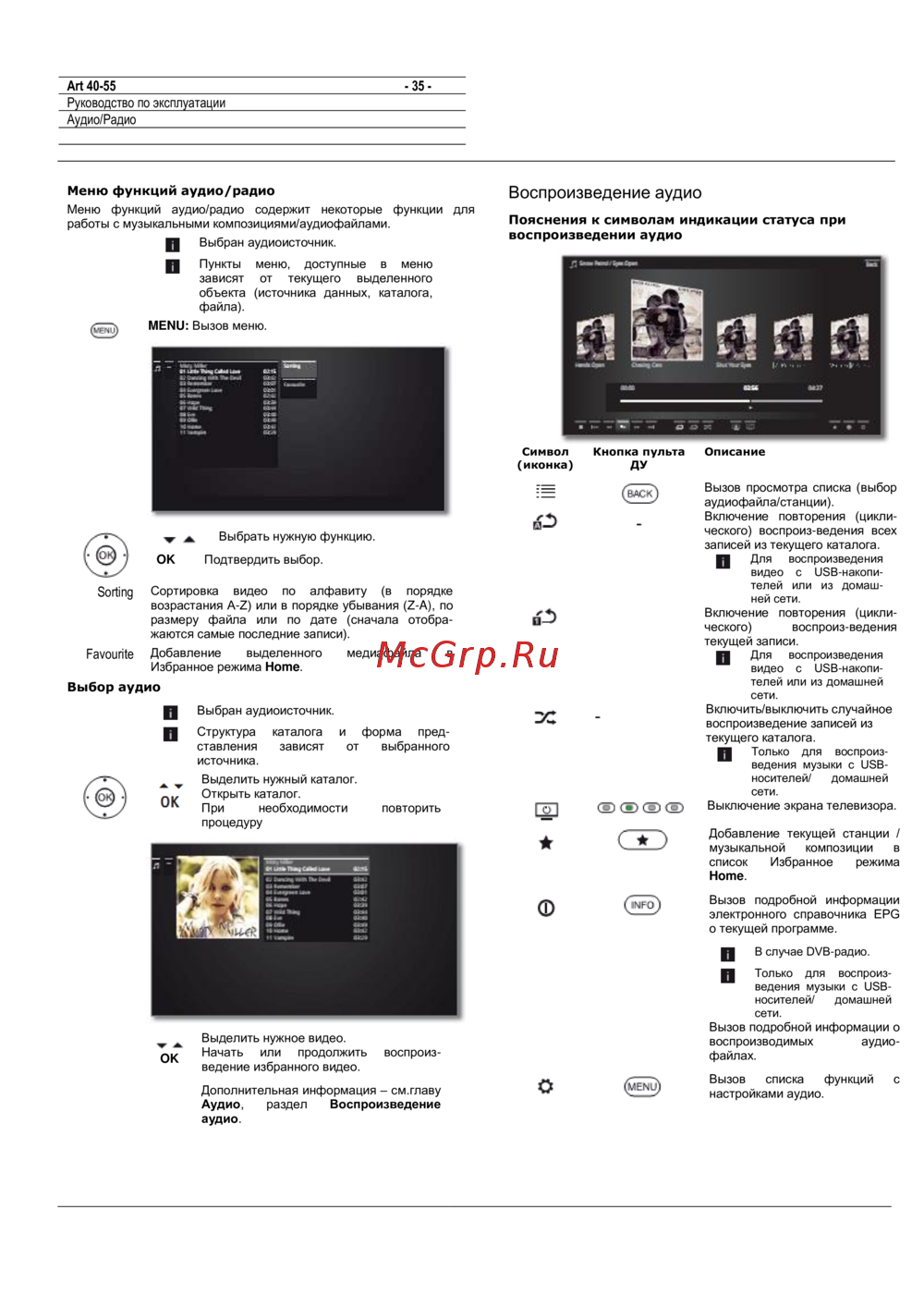 Изучите функции и настройки аудио и радио, включая воспроизведение, сортировку и добавление в Избранное. Узнайте, как управлять музыкальными композициями и аудиофайлами.