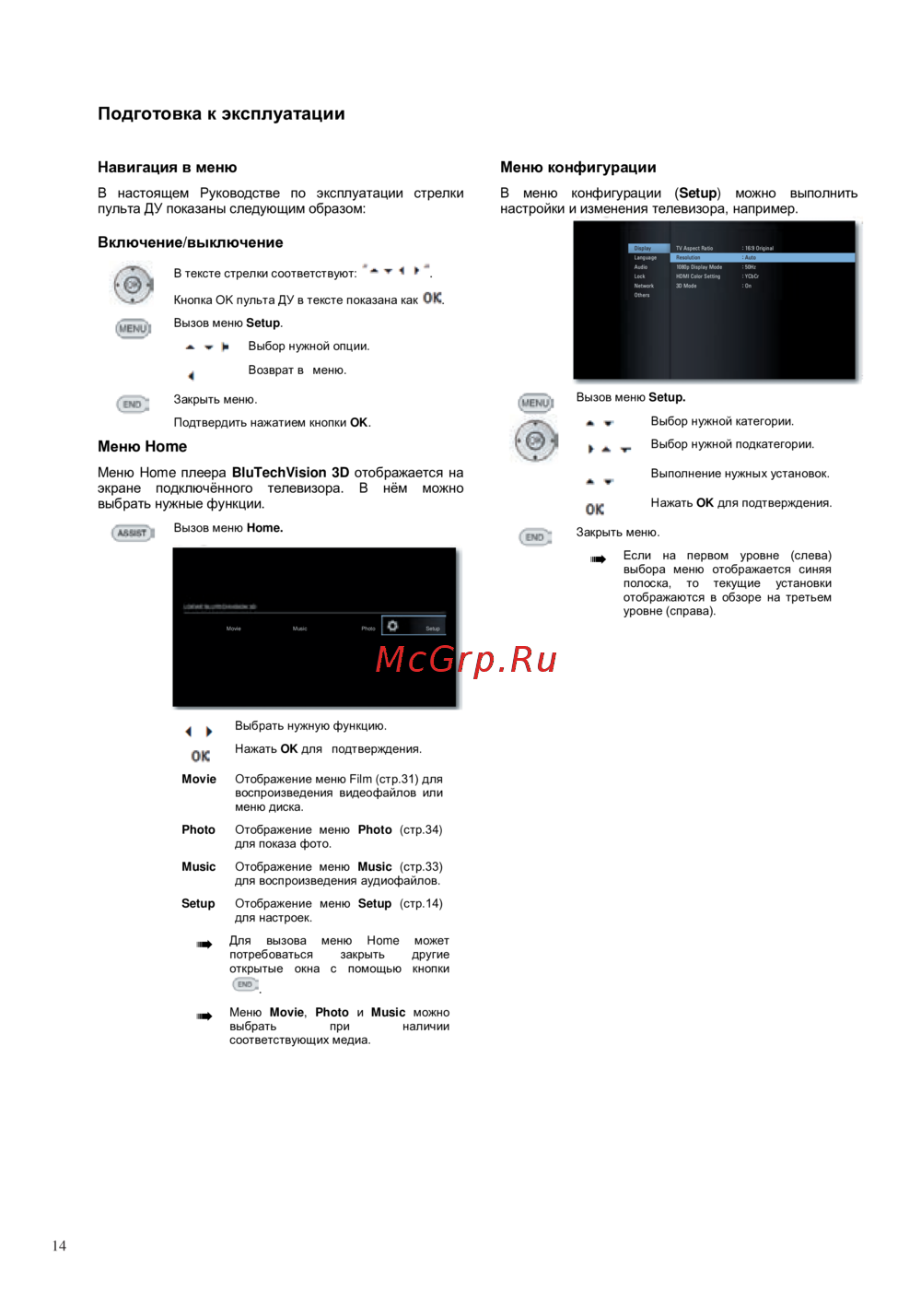 Setup Отображение меню Setup (стр.14)