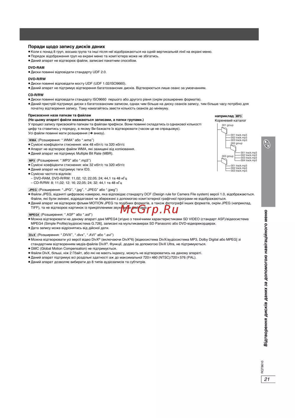 Навігаційне меню RQT8610: Відтворення DVD/CD дисков. Підтримка WMA, MP3, JPEG, MPEG4, DivX. Технічні деталі та рекомендації для запису.