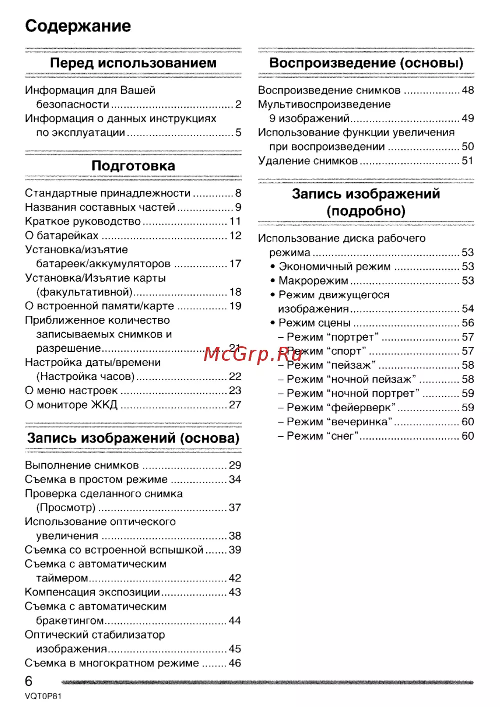 Содержание Перед использованием ЛЖ Воспроизведение основы 4 Ж даМЛ М ЛЧГ ЖХЗДФ ХЛХ Информация для Вашей безопасности 2 Информация о данных инструкциях по эксплуатации 5 Подготовка Воспроизведение снимков 48 Мультивоспроизведение 9 изображений 49 Использование функции увеличения при воспроизведении 50 Удаление снимков 51 ч тчх хад х х лжхге х х жх гфмж ггфффчяЖ Ч Ч ЖЖЖЖХпхЖ ИЖ ы фф Ж ж да Х Стандартные принадлежности 8 Названия составных частей 9 Краткое руководство 11 О батарейках 12 Установка изъятие батареек аккумуляторов 17 Установка Изъятие карты факультативной 18 О встроенной памяти карте 19 Приближенное количество записываемых снимков и разрешение 21 Настройка даты времени Настройка часов 22 О меню настроек 23 О мониторе ЖКД 27 Запись изображений основа Выполнение снимков 29 Съемка в простом режиме 34 Проверка сделанного снимка Просмотр 37 Использование оптического увеличения 38 Съемка со встроенной вспышкой 39 Съемка с автоматическим таймером 42 Компенсация экспозиции 43 Съемка с автоматическим бракетингом 44 Оптический стабилизатор изображения 45 Съемка в многократном режиме 46 6 Запись изображений подробно Использование диска рабочего режима 53 Экономичный режим 53 Макрорежим 53 Режим движущегося изображения 54 Режим сцены 56 Режим портрет 57 Режим спорт 57 Режим пейзаж 58 Режим ночной пейзаж 58 Режим ночной портрет 59 Режим фейерверк 59 Режим вечеринка 60 Режим снег 60