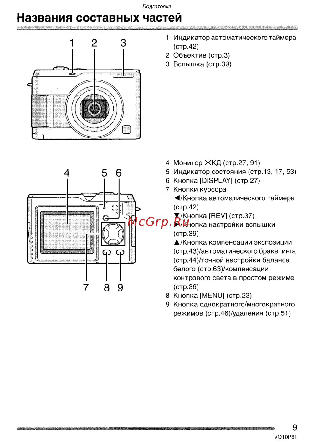 Подготовка Названия составных частей 1 Индикатор автоматического таймера стр 42 2 Объектив стр З 3 Вспышка стр 39 4 Монитор ЖКД стр 27 91 5 Индикатор состояния стр 13 17 53 6 Кнопка DISPLAY стр 27 7 Кнопки курсора Кнопка автоматического таймера стр 42 Кнопка REV стр 37 Кнопка настройки вспышки стр 39 A Кнопка компенсации экспозиции стр 43 автоматического бракетинга стр 44 точной настройки баланса белого стр 63 компенсации контрового света в простом режиме стр 36 8 Кнопка MENU стр 23 9 Кнопка однократного многократного режимов стр 46 удаления стр 51