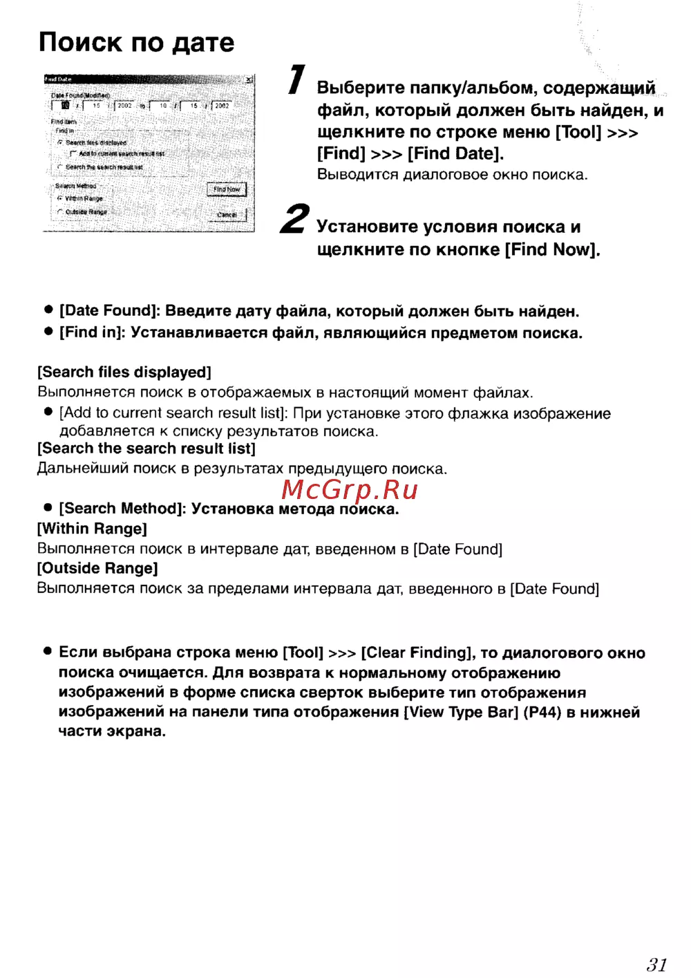 Поиск по дате hiidOdt ОШ __ I ШГ Р J й f р i 5 Mdw fw4m search fir dismayed i г Search the saerth Thwit iist 7 Выберите папку альбом содержащий файл который должен быть найден и щелкните по строке меню Tool Find Find Date Выводится диалоговое окно поиска SMTCtl WethQd л УШП Rar f MSrtte Й Ш 2 Установите условия поиска и щелкните по кнопке Find Now Date Found Введите дату файла который должен быть найден Find in Устанавливается файл являющийся предметом поиска Search files displayed Выполняется поиск в отображаемых в настоящий момент файлах Add to current search result list При установке этого флажка изображение добавляется к списку результатов поиска Search the search result list Дальнейший поиск в результатах предыдущего поиска Search Method Установка метода поиска Within Range Выполняется поиск в интервале дат введенном в Date Found Outside Range Выполняется поиск за пределами интервала дат введенного в Date Found Если выбрана строка меню Tool Clear Finding то диалогового окно поиска очищается Для возврата к нормальному отображению изображений в форме списка сверток выберите тип отображения изображений на панели типа отображения View Type Bar Р44 в нижней части экрана