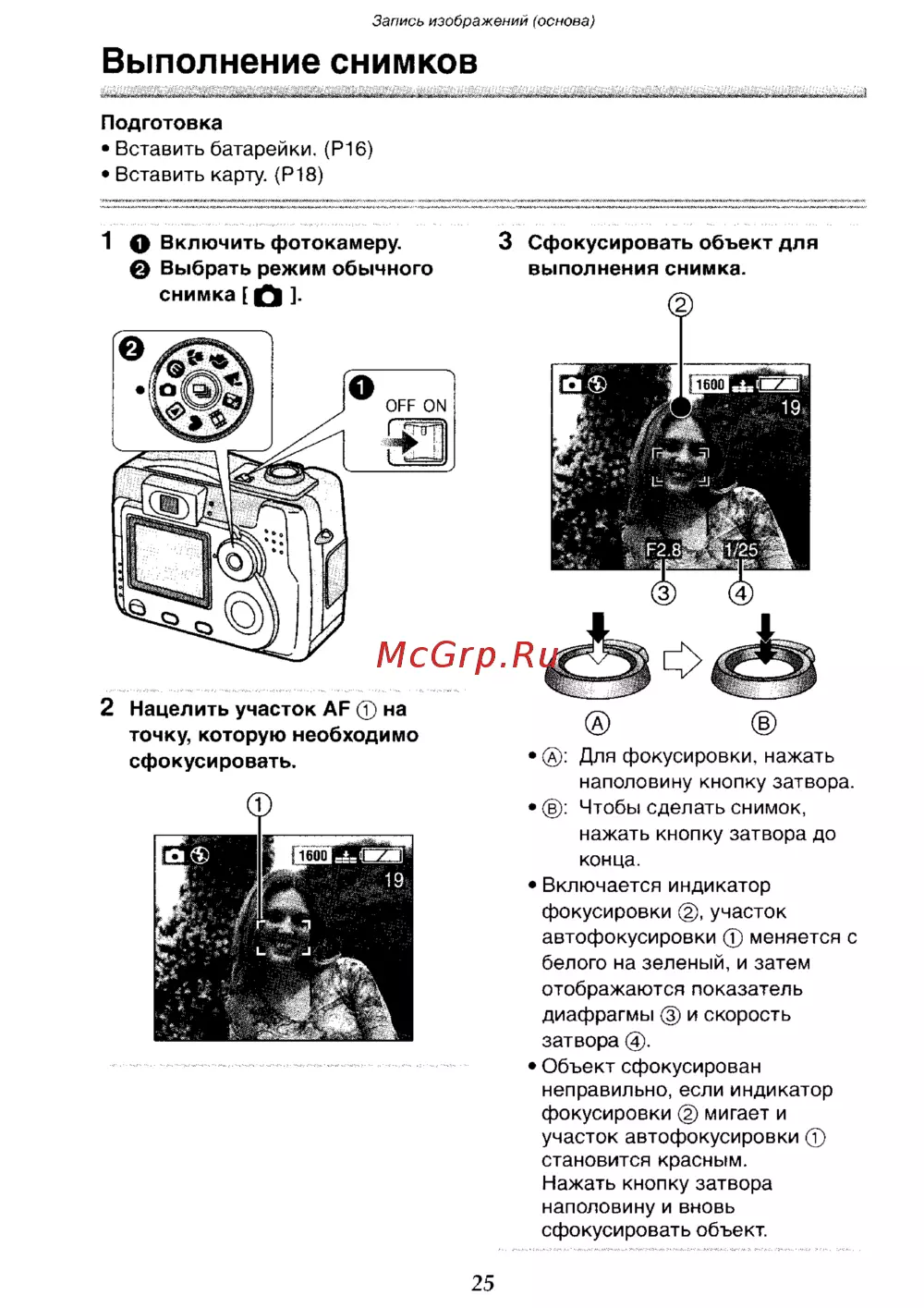 Запись изображений основа Выполнение снимков Подготовка Вставить батарейки Р16 Вставить карту Р18 1 О Включить фотокамеру 0 Выбрать режим обычного 3 Сфокусировать объект для выполнения снимка снимка О 2 Нацелить участок АР ф на точку которую необходимо сфокусировать Для фокусировки нажать наполовину кнопку затвора Чтобы сделать снимок нажать кнопку затвора до конца Включается индикатор фокусировки участок автофокусировки ф меняется с белого на зеленый и затем отображаются показатель диафрагмы и скорость затвора Объект сфокусирован неправильно если индикатор фокусировки мигает и участок автофокусировки ф становится красным Нажать кнопку затвора наполовину и вновь сфокусировать объект