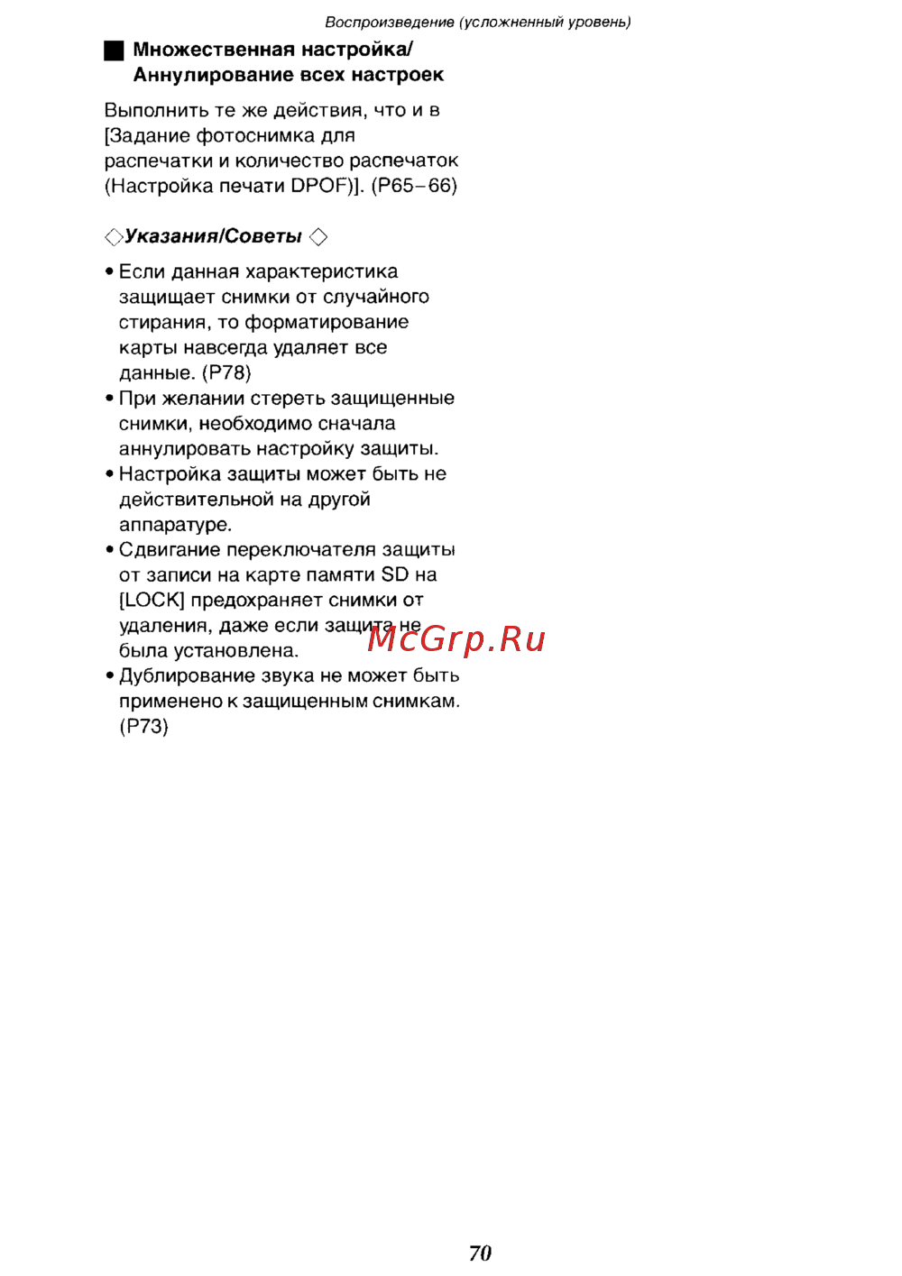 Воспроизведение Множественная настройка Аннулирование всех настроек Выполнить те же действия что и в Задание фотоснимка для распечатки и количество распечаток Настройка печати DPOF Р65 66 Указания Советы О Если данная характеристика защищает снимки от случайного стирания карты то форматирование навсегда удаляет все данные Р78 При желании стереть защищенные снимки необходимо сначала аннулировать настройку защиты Настройка защиты может быть действительной на другой не аппаратуре Сдвигание переключателя защиты от записи на карте памяти SD на LOCK предохраняет снимки от удаления даже если была установлена Дублирование применено к Р73 защита не звука не может быть защищенным снимкам усложненный уровень