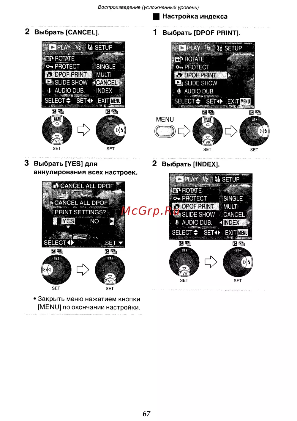 Воспроизведение усложненный уровень Настройка индекса 2 Выбрать CANCEL 1 Выбрать DPOF PRINT iSF ROTATE 5 On PROTECT S 3SSSS COPLAY Vs U SETUP U SETUP ROTATE SINGLE fo PROTECT MULTI Л DPOF PRINT nil SLIDE SHOW SLIDE SHOW 1 AUDIO DUB INDEX j Ф AUDJO DUB O WK SELECTV SET SELH K EXITED ___ Li_____ __ ______ EXIT эф MENU SET SET SET 3 Выбрать YES для SET 2 Выбрать INDEX аннулирования всех настроек CANCEL ALL DPOF tiii I CANCEL ALL DPOF MULTI g PRINT SETTINGS üä I Я NO П1 SELECT Oli SLIDE SHOW CANCEL Ф AUDIO DUB к SELECTS SETO FXITf SET S SET SET SET Закрыть меню нажатием кнопки MENU по окончании настройки SET