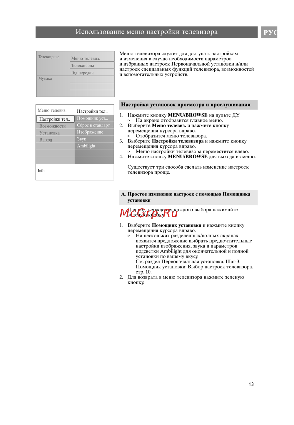 - Примечание если процедура установки уже была выполнена и или необходимо изменить параметры первоначальной установки перейдите к разделу использование меню настройки телевизора стp 13 p.8