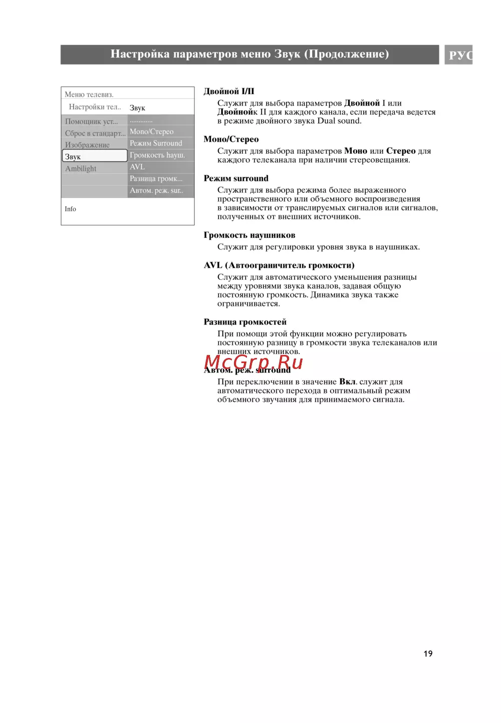 Philips 32 PF 9731D/10 — настройка параметров звука: режимы стерео, моно, surround, громкость и AVL [19/87]