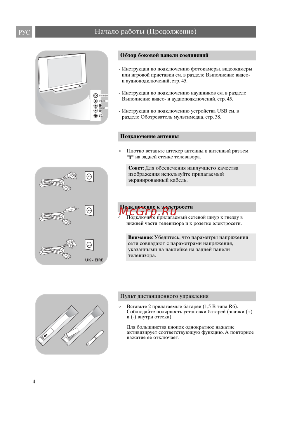 - Внимание убедитесь что параметры напряжения сети совпадают с параметрами напряжения указанными на наклейке на задней панели телевизора p.4