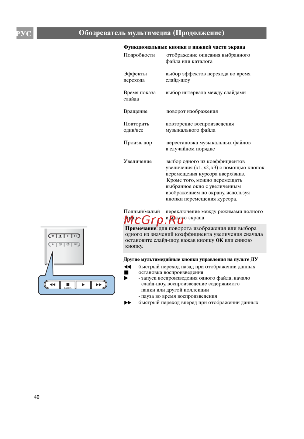 Изучите функциональные кнопки управления мультимедиа, включая эффекты перехода, увеличение изображений и управление воспроизведением. Удобные настройки для комфортного просмотра.