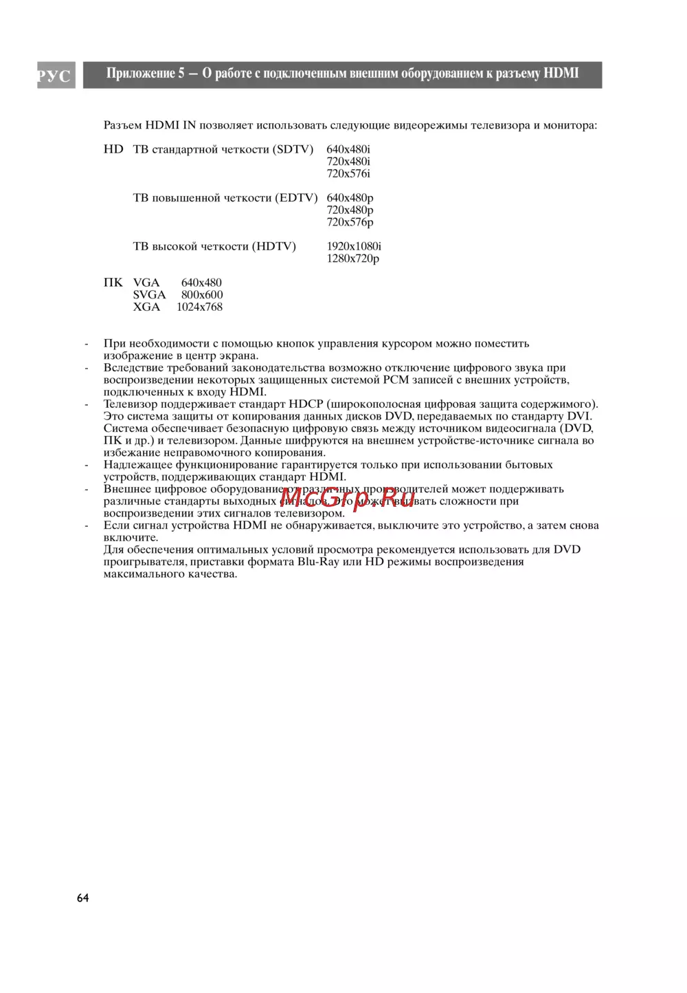 - Приложение 5 о работе с подключенным внешним оборудованием к разъему hdmi p.64