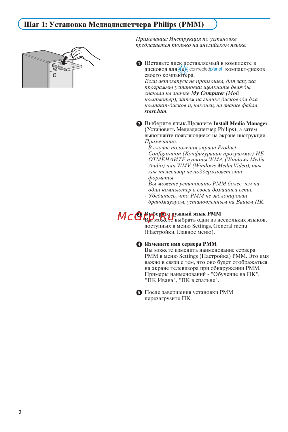 - Шаг 1 установка медиадиспетчера philips pmm p.68