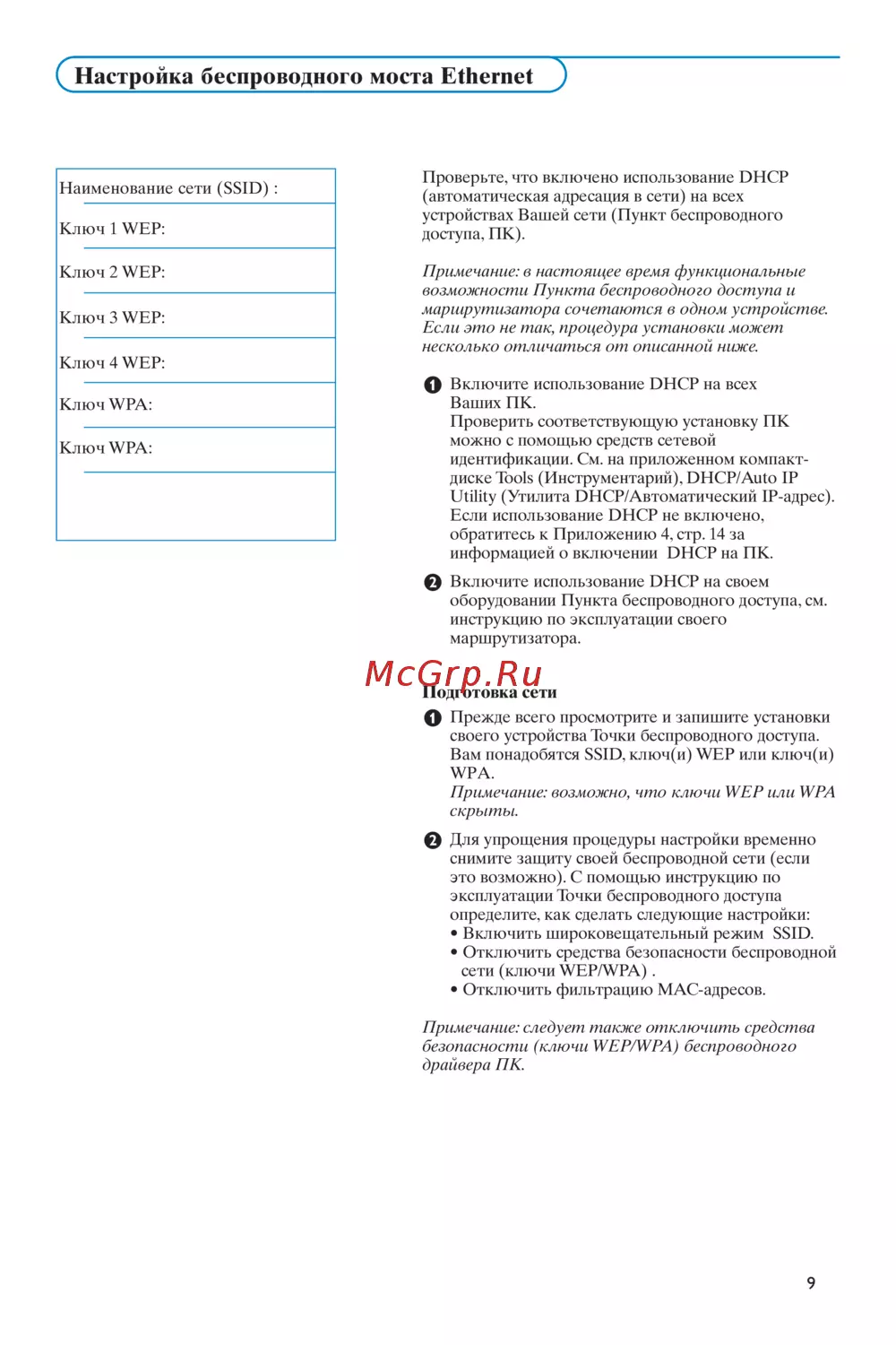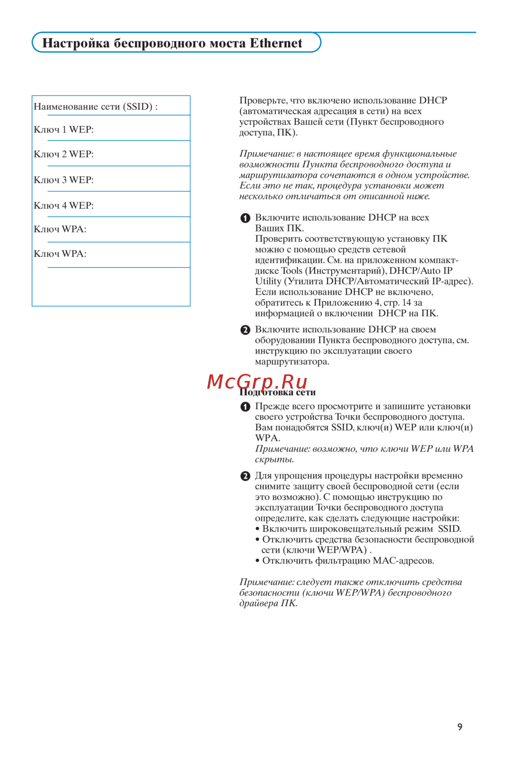 Вам понадобятся SSID, ключ(и) WEP или ключ(и)