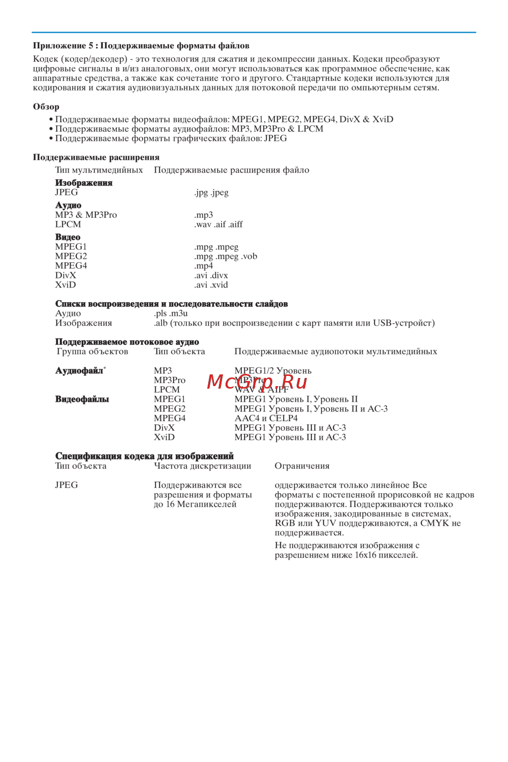 • Поддерживаемые форматы аудиофайлов: MP3, MP3Pro & LPCM