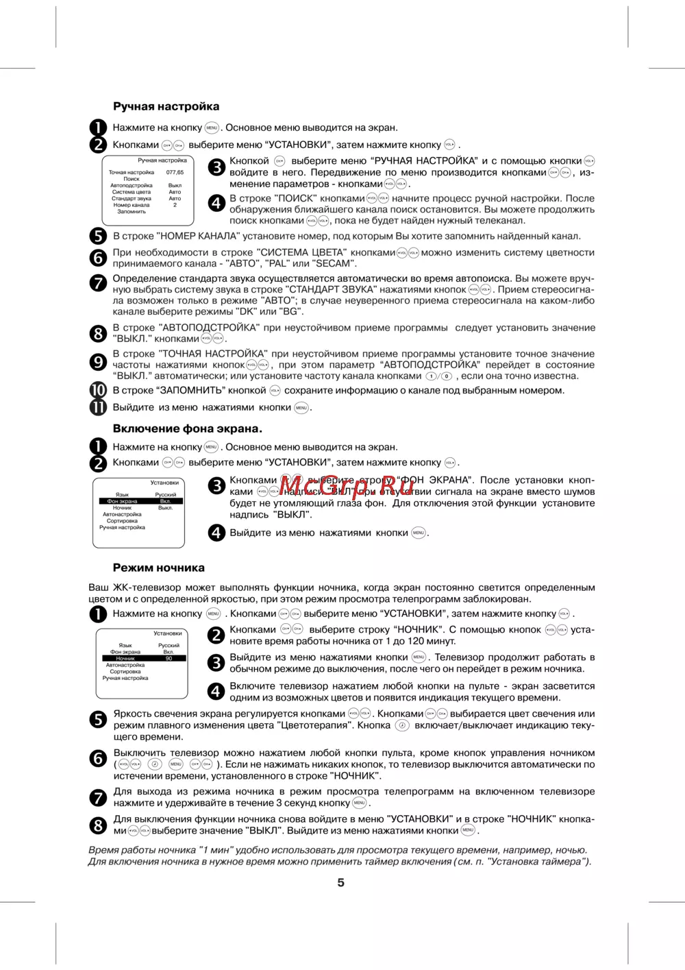 Ручная настройка 8 Нажмите на кнопку Основное меню выводится на экран Кнопками выберите меню УСТАНОВКИ затем нажмите кнопку Ручная настройка Точная настройка 077 65 Поиск Автоподстройка Выкл Система цвета Авто Стандарт звука Авто Номер канала 2 Запомнить Кнопкой выберите меню РУЧНАЯ НАСТРОЙКА и с помощью кнопки в него Передвижение по меню производится кнопками из войдите менение параметров кнопками В строке ПОИСК кнопками начните процесс ручной настройки После ближайшего канала поиск остановится Вы можете продолжить О обнаружения поиск кнопками пока не будет найден нужный телеканал В строке НОМЕР КАНАЛА установите номер под которым Вы хотите запомнить найденный канал При необходимости в строке СИСТЕМА ЦВЕТА кнопками можно изменить систему цветности принимаемого канала АВТО PAL или SECAM Определение стандарта звука осуществляется автоматически во время автопоиска Вы можете вруч выбрать систему звука в строке СТАНДАРТ ЗВУКА нажатиями кнопок Прием стереосигна в лануювозможен только в режиме АВТО в случае неуверенного приема стереосигнала на каком либо канале выберите режимы ОК или ВС В строке АВТОПОДСТРОЙКА при неустойчивом приеме программы следует установить значение ВЫКЛ кнопками В строке ТОЧНАЯ НАСТРОЙКА при неустойчивом приеме программы установите точное значение нажатиями кнопок при этом параметр АВТОПОДСТРОЙКА перейдет в состояние частоты ВЫКЛ автоматически или установите частоту канала кнопками если она точно известна В строке ЗАПОМНИТЬ кнопкой сохраните информацию о канале под выбранным номером Выйдите изменю нажатиями кнопки Включение фона экрана 8 Нажмите на кнопку Основное меню выводится на экран Кнопками выберите меню УСТАНОВКИ затем нажмите кнопку Установки Язык_________ Русский Фон экрана________ Вкл Ночник Выкл Автонастройка Сортировка Ручная настройка Кнопками выберите строку ФОН ЭКРАНА После установки кноп ками надписи ВКЛ при отсутствии сигнала на экране вместо шумов будет не утомляющий глаза фон Для отключения этой функции установите надпись ВЫКЛ Выйдите из меню нажатиями кнопки Режим ночника Ваш ЖК телевизор может выполнять функции ночника когда экран постоянно светится определенным цветом и с определенной яркостью при этом режим просмотра телепрограмм заблокирован Нажмите на кнопку Установки Язык Русский Фон экрана________ Вкл Ночник___________90 Автонастройка Сортировка Ручная настройка Кнопками выберите меню УСТАНОВКИ затем нажмите кнопку Кнопками выберите строку НОЧНИК С помощью кнопок уста новите время работы ночника от 1 до 120 минут Выйдите из меню нажатиями кнопки Телевизор продолжит работать в обычном режиме до выключения после чего он перейдет в режим ночника Включите телевизор нажатием любой кнопки на пульте экран засветится одним из возможных цветов и появится индикация текущего времени Яркость свечения экрана регулируется кнопками Кнопками выбирается цвет свечения или режим плавного изменения цвета Цветотерапия Кнопка включает выключает индикацию теку щего времени Выключить телевизор можно нажатием любой кнопки пульта кроме кнопок управления ночником Если не нажимать никаких кнопок то телевизор выключится автоматически по истечении времени установленного в строке НОЧНИК Для выхода из режима ночника в режим просмотра телепрограмм на включенном телевизоре нажмите и
