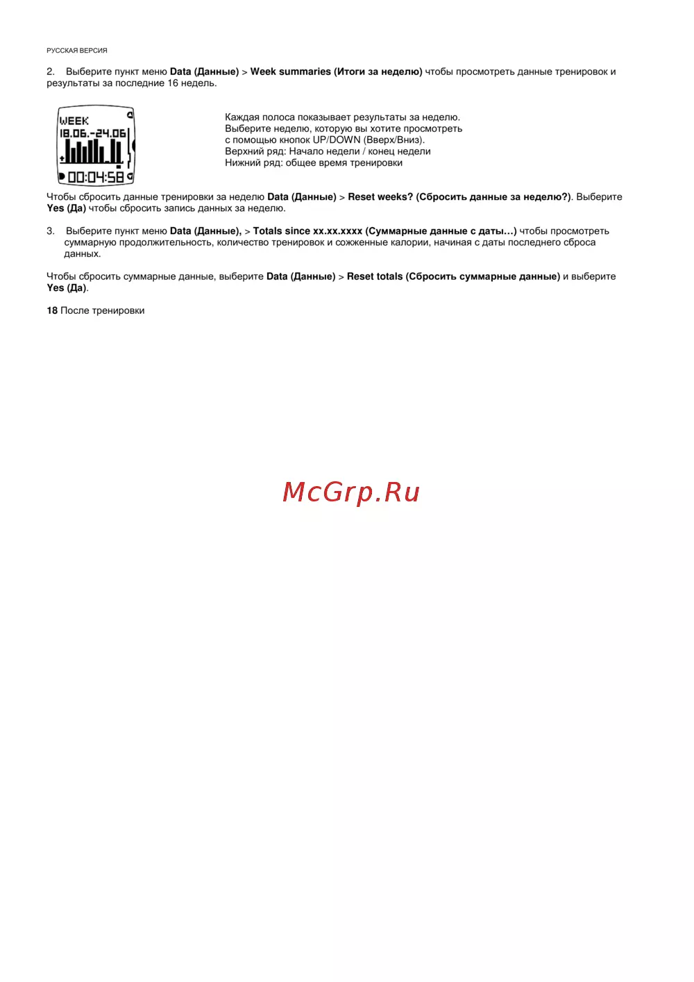 Чтобы сбросить данные тренировки за неделю Data (Данные) > Reset weeks? (Сбросить данные за неделю?). Выберите