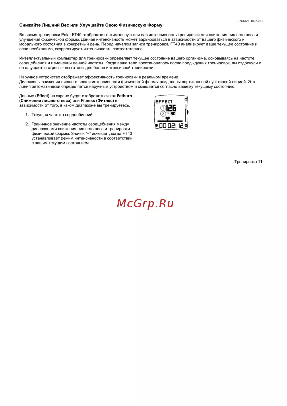 Во время тренировки Polar FT40 отображает оптимальную для вас интенсивность тренировки для снижения лишнего веса и