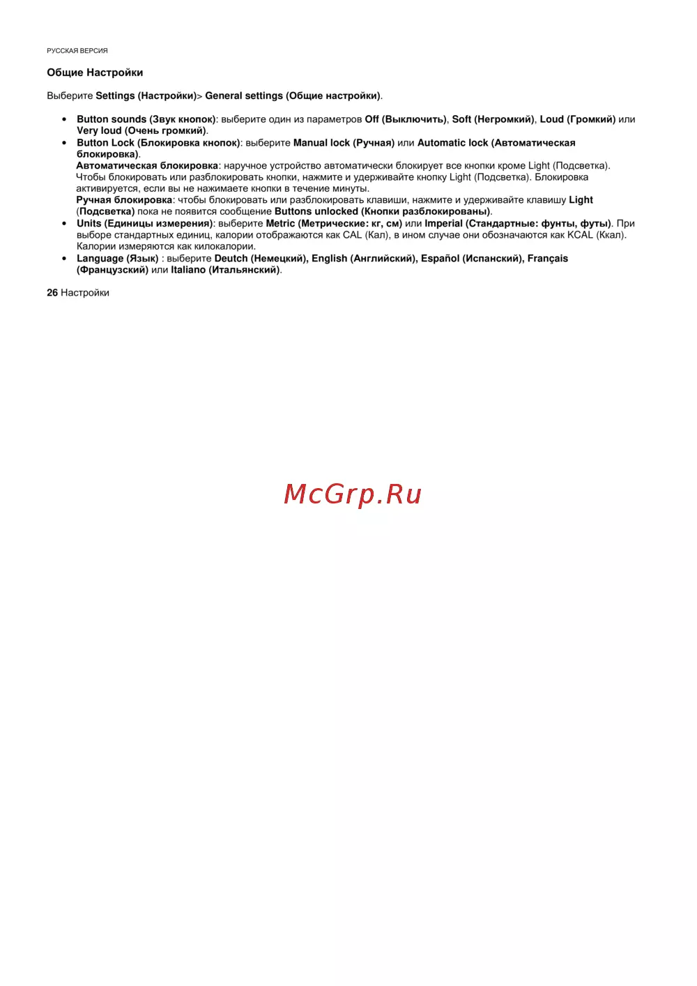Настройте звуки кнопок, блокировку и единицы измерения на устройстве. Выберите между ручной и автоматической блокировкой, а также языком интерфейса.
