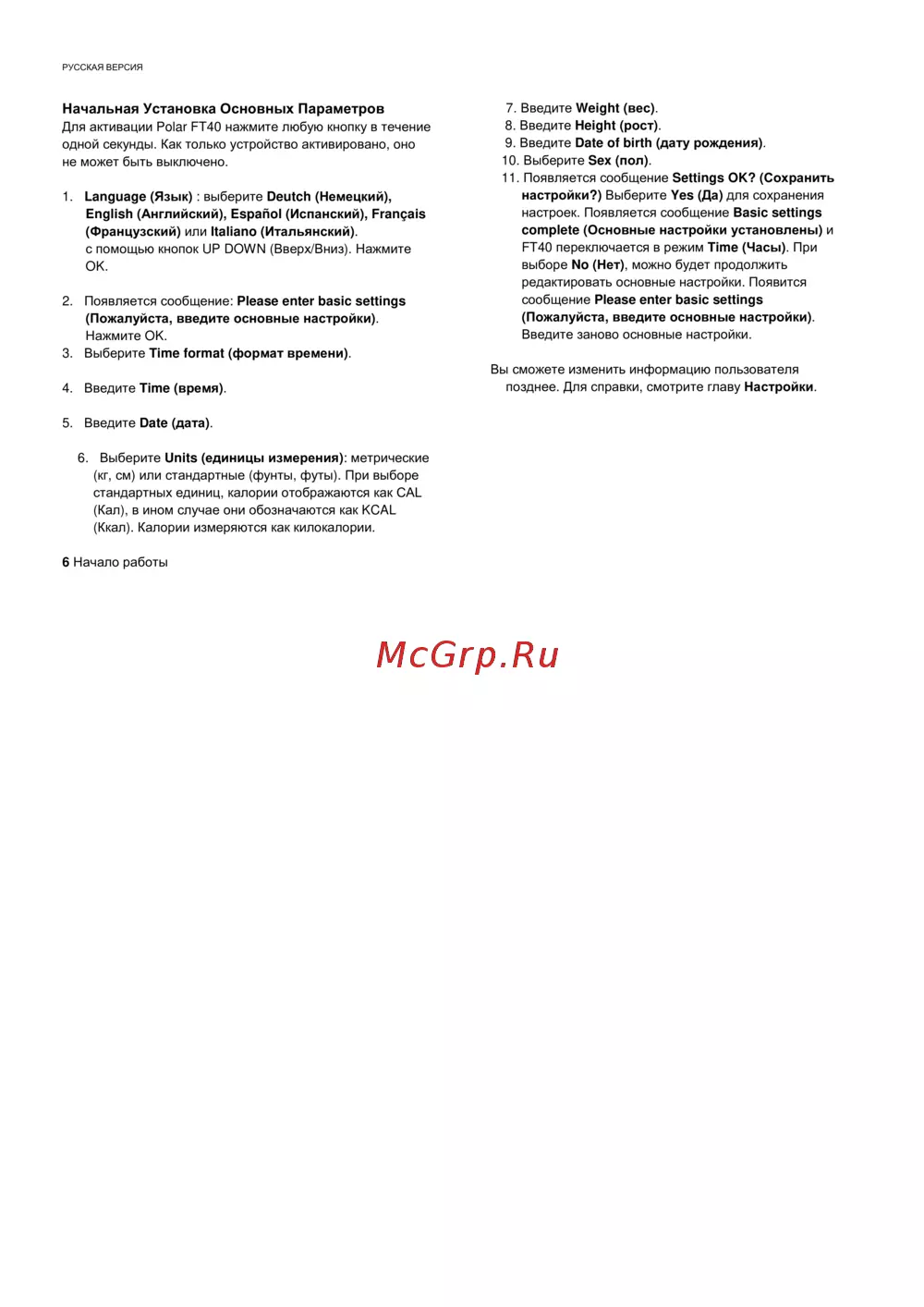 Polar FT60 — инструкция по начальной установке основных параметров устройства [7/38]