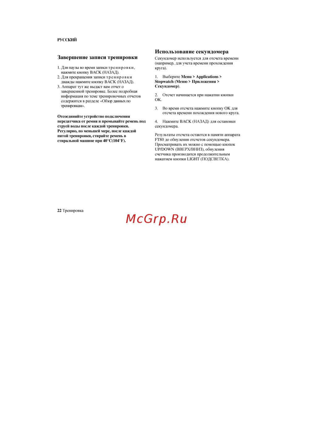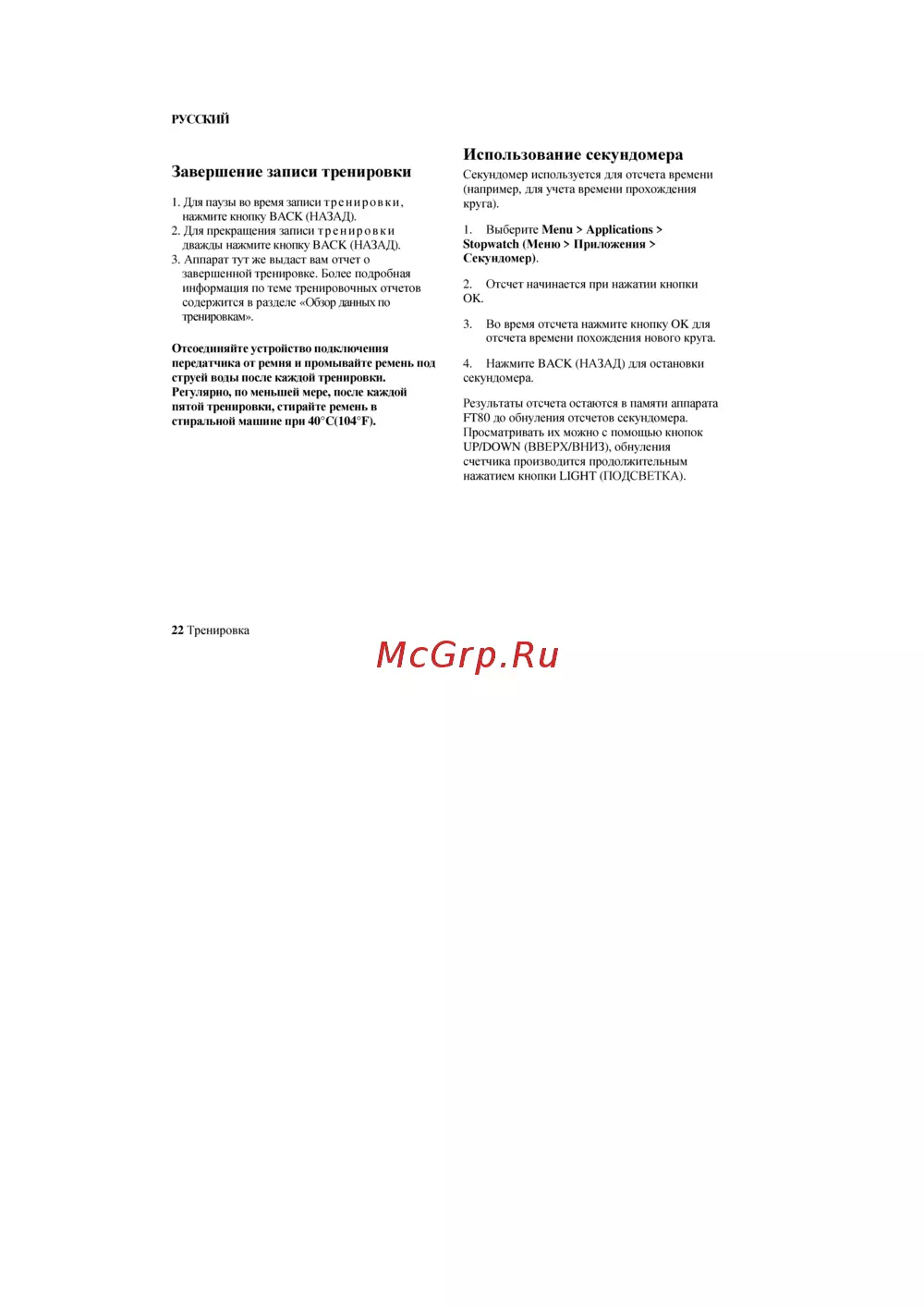 Polar FT80 — завершение записи тренировки и использование секундомера [22/46]