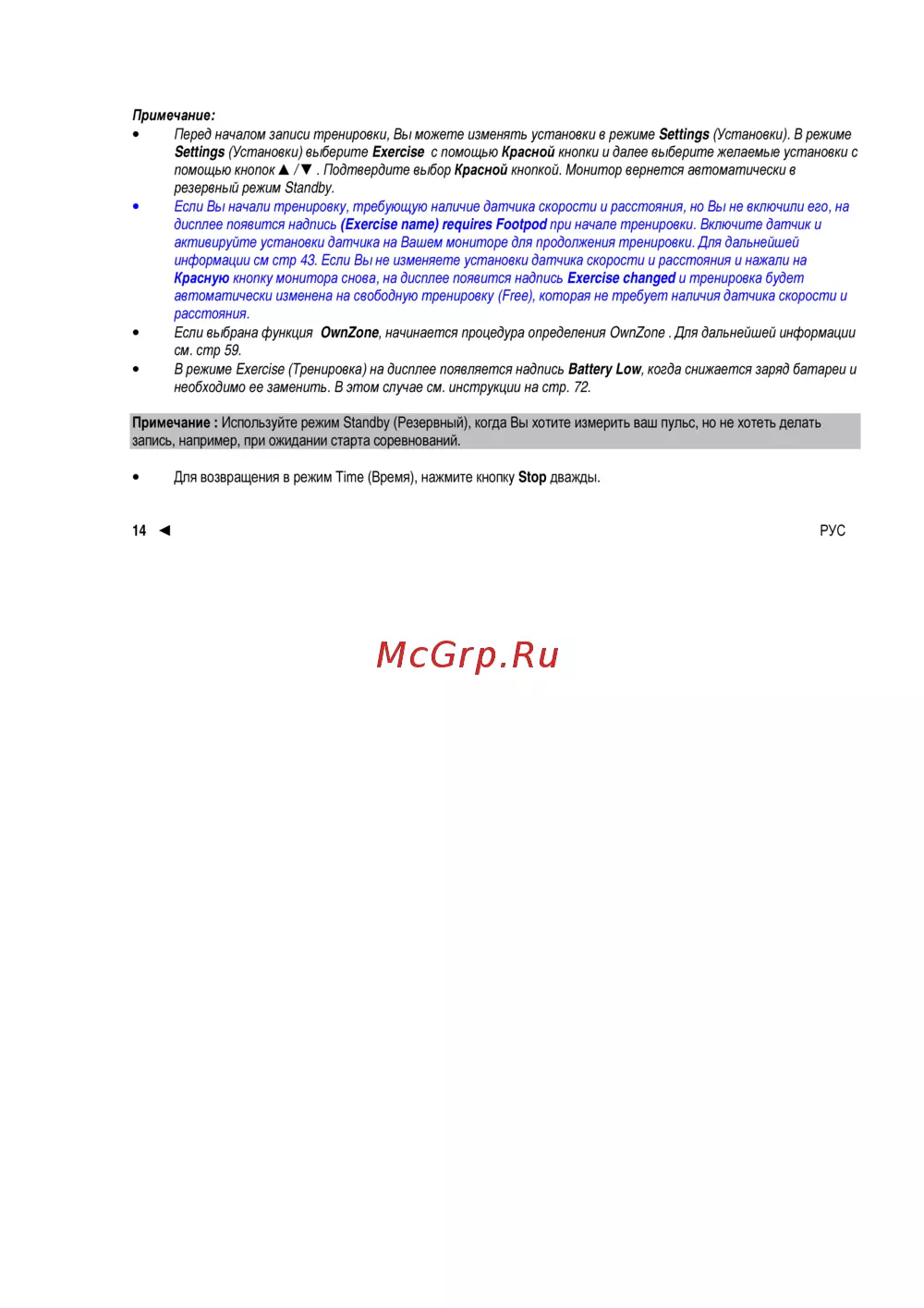 Примечание : Используйте режим Standby (Резервный), когда Вы хотите измерить ваш пульс, но не хотеть делать
