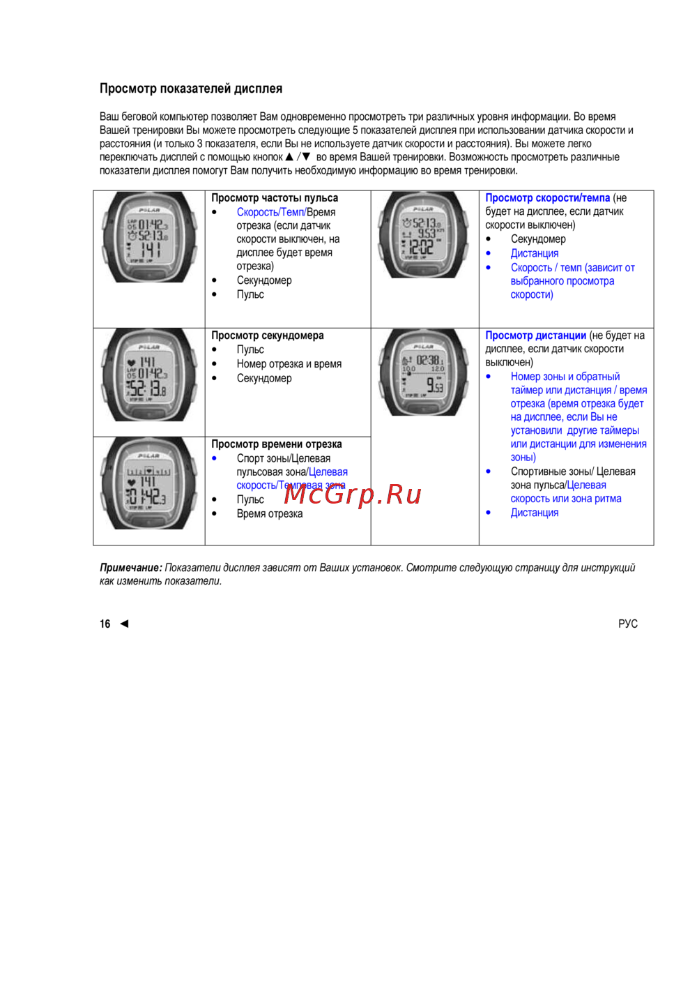 переключать дисплей с помощью кнопок ▲/ ▼ во время Вашей тренировки. Возможность просмотреть различные